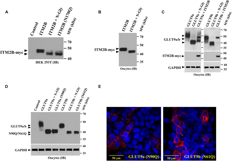 FIGURE 4. ITM2B and GLUT9 are N-glycosylated transmembrane proteins; effect of ITM2B on N-glycosylation of GLUT9 isoforms in oocytes. (A) Western blot analysis of the lysate of transfected HEK 293T expressing ITMB-myc protein or N-glycosylation-deficient mutant ITM2B (N170Q)-myc protein, digested with and without N-glycanase (N-gly) in vitro. (B) Western blot analysis of the lysate of Xenopus oocytes expressing ITMB-myc protein, digested with and without N-glycanase (N-gly) in vitro. (C) Western blot analysis of the lysate of Xenopus oocytes expressing either isoform of GLUT9 (GLUT9a/b) alone or co-expressed with ITM2B-myc, digested with and without N-glycanase (N-gly) in vitro. GAPDH protein band for each sample acts as a loading control. (D) Western blot analysis of the lysate of Xenopus oocytes expressing either isoform of GLUT9 or their respective N-glycosylation-deficient mutants (GLUT9a-N90Q or GLUT9b-N61Q), generated by site-directed mutagenesis of the shared residues Asn-90 in GLUT9a and Asn-61 in GLUT9b. The molecular sizes of GLUT9 isoforms were compared before and after digestion with N-glycanase (N-gly). (E) Cell membrane localization of N-glycosylation-deficient mutants, GLUT9a-N90Q and GLUT9b-N61Q, in transiently transfected HEK 293T cells, was detected by confocal immunofluorescence microscopy using rabbit anti-GLUT9 antibody and Alexa Fluor 594 conjugated anti-rabbit IgG. ITM2B-myc or its mutant and GLUT9 isoforms or its mutants were detected by rabbit anti-myc antibody and rabbit anti-GLUT9 antibody respectively. IB, immunoblotting.