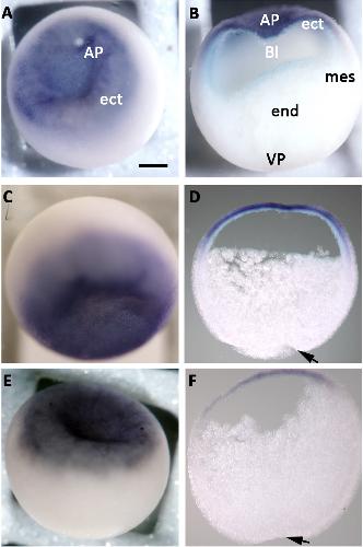 Figure 2. trpc1 is expressed in the ectoderm of blastula and gastrula stage embryos. Spatial expression of trpc1 mRNA in blastula and gastrula stage embryos. Whole mount in situ hybridization was performed on embryos fixed at blastula (stage 9), early gastrula (stage 10.5) and late gastrula (stage 11.5). (A) Expression of trpc1 at stage 9 in an intact embryo (animal pole view), showing that the ectoderm is labelled. (B) Sagittal section taken through the embryo shown in panel A, indicating trpc1 expression in the ectoderm alone; the mesoderm and endoderm were not labelled. (C) Expression of trpc1 in an intact embryo at stage 10.5 (animal pole view). (D) Sagittal section taken through the embryo shown in panel (C), showing trpc1 expression in the ectoderm, with no difference in the level of expression between the dorsal and the ventral sides. (E) Expression of trpc1 in an intact embryo at stage 11.5 (animal pole view). (F) Sagittal section taken through the embryo shown in panel E. AP, VP, ect, mes, end and Bl are animal pole, vegetal pole, ectoderm, mesoderm endoderm and blastocoel, respectively. In panels (D) and (F), dorsal is to the right and the arrows indicate the blastopore lip. Scale bar is 300 µm. |