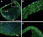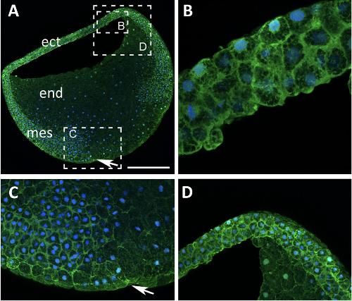 Figure 3. Pattern of localization of Trpc1 in gastrula stage embryos. (A) Single optical view of a sagittal section taken though a gastrula stage embryo, showing the localization of Trpc1 in the ectoderm (ect) and mesoderm (mes). There is a lower level of Trpc1 expression in the endoderm (end). The arrow indicates the position of the blastopore lip. The regions bounded by the dashed white rectangles are shown at higher magnification in panels (BâD). These images show that at the cellular level, Trpc1 is localized mainly in the plasma membrane. Trpc1 localization, shown in green, was revealed with the rabbit anti-Trpc1 polyclonal antibody and an Alexa-555-conjugated anti-rabbit secondary antibody. The nuclei (in blue) were labelled with ToPro3. Scale bars are 300 µm in panel (A), and 40 µm in panels (BâD). |