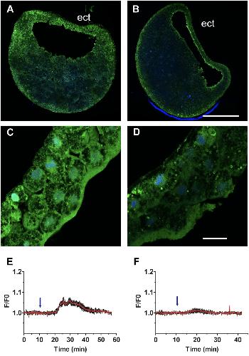 Figure 4. Trpc1 knock down reduces the expression of Trpc1 in the ectoderm and abolishes the increase in intracellular Ca2+ generated following activation of CaV1.2 channels in animal cap explants. (AâD) Embryos at the 2-cell stage were injected with (AâC) control-MO or (BâD) TRPC1-MO1 into both blastomeres, and the expression of Trpc1 was revealed by immunostaining at the blastula stage. (A,B) Confocal view of sagittal section taken through the entire embryo. (C,D) Confocal view at the level of the ectoderm. trpc1 knock-down impaired the expression of Trpc1. The nuclei (in blue) were labelled with ToPro3. Scale bars are 350 µm in (A,B) and 40 µm in (C,D). (E,F) Relative changes in fluorescence (F/F0) revealing changes in intracellular Ca2+ generated in single animal caps loaded with the Ca2+-indicator Fluo4 and isolated from embryos injected with either (E) control-MO or (F) TRPC1-MO1. The data are plotted as the mean of F/F0 (red traces)â+âSEM (black bars) from 7 (E) or 10 (F) randomly selected fields within a single animal cap. Noggin (2 µg/mL) was added (blue arrows) within the first 10 min after the start of data acquisition. Additional data are provided in Figure S3. |