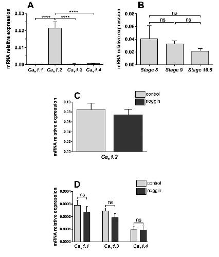 Figure S1: Expression of CaV1.x mRNA in X. laevis. (A) RT-qPCR analysis of Cav1.1, Cav1.2, Cav1.3 and Cav1.4 in ectoderm (animal caps) isolated at mid-gastrula (stage 10.5). The expression levels were normalized to the housing keeping gene odc (ornithine decarboxylase). The expression level Cav1.2 mRNA was significantly higher than that of Cav1.1, Cav1.3 and Cav1.4, in animal caps (one way ANOVA with Bonferroniâs test, ****P<0.0001). The data represent the mean ± SEM of 4 independent experiments, with 20 animal caps being used for each experiment. (B) RT-qPCR analysis of Cav1.2 in ectoderm (animal caps) isolated from embryos before gastrulation (stage 8 and stage 9) and at midgastrula (stage 10.5). The expression levels were normalized to the housing keeping gene odc (ornithine decarboxylase). No significant changes in Cav1.2 mRNA levels occurred during these 3 stages (one-way ANOVA with Bonferroniâs test, P<0.05). The data represent the mean ± SEM of 4 and 5 independent experiments for stage 8 and 10.5, and for stage 9, respectively, such that in each experiment there were 20 animal caps. (C-D) Histograms to show RT-qPCR analysis of Cav1.2 (C) and of Cav1.1, Cav1.3 and Cav1.4 (D) in control stage 9 animal caps and in noggin-treated stage 9 animal caps. The level of expression was normalized to the housing keeping gene odc (ornithine decarboxylase). No significant changes in the mRNA levels of Cav1.1, Cav1.2, Cav1.3, and Cav1.4 were observed when comparing control and noggin-treated animal caps (Mann-Whitney test). The data represent the mean ± SEM of 10 independent experiments, with 20 animal caps per experiment. |