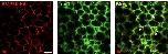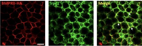Figure S5: Trpc1 channels are co-expressed with BMPRII. Immunostaining of Trpc1 protein in anterior ectoderm of a representative stage 10 embryo. Xenopus BMPRII-HA (200 pg/cell) was injected into all the blastomeres of 4-cell embryos. The presence of HA-tagged BMPRII proteins and Trpc1 were revealed with an anti-HA antibody and a rabbit anti-Trpc1 polyclonal primary antibody, respectively. The secondary antibodies were Alexa-555-conjugated anti-mouse and Alexa-488- conjugated anti-rabbit for HA-tagged BMPRII and Trpc1, respectively. These images show the same confocal plane and indicate the co-expression of BMPRII-HA with Trpc1, which appears in yellow (see white arrows). Scale bar represents 30 µm. |