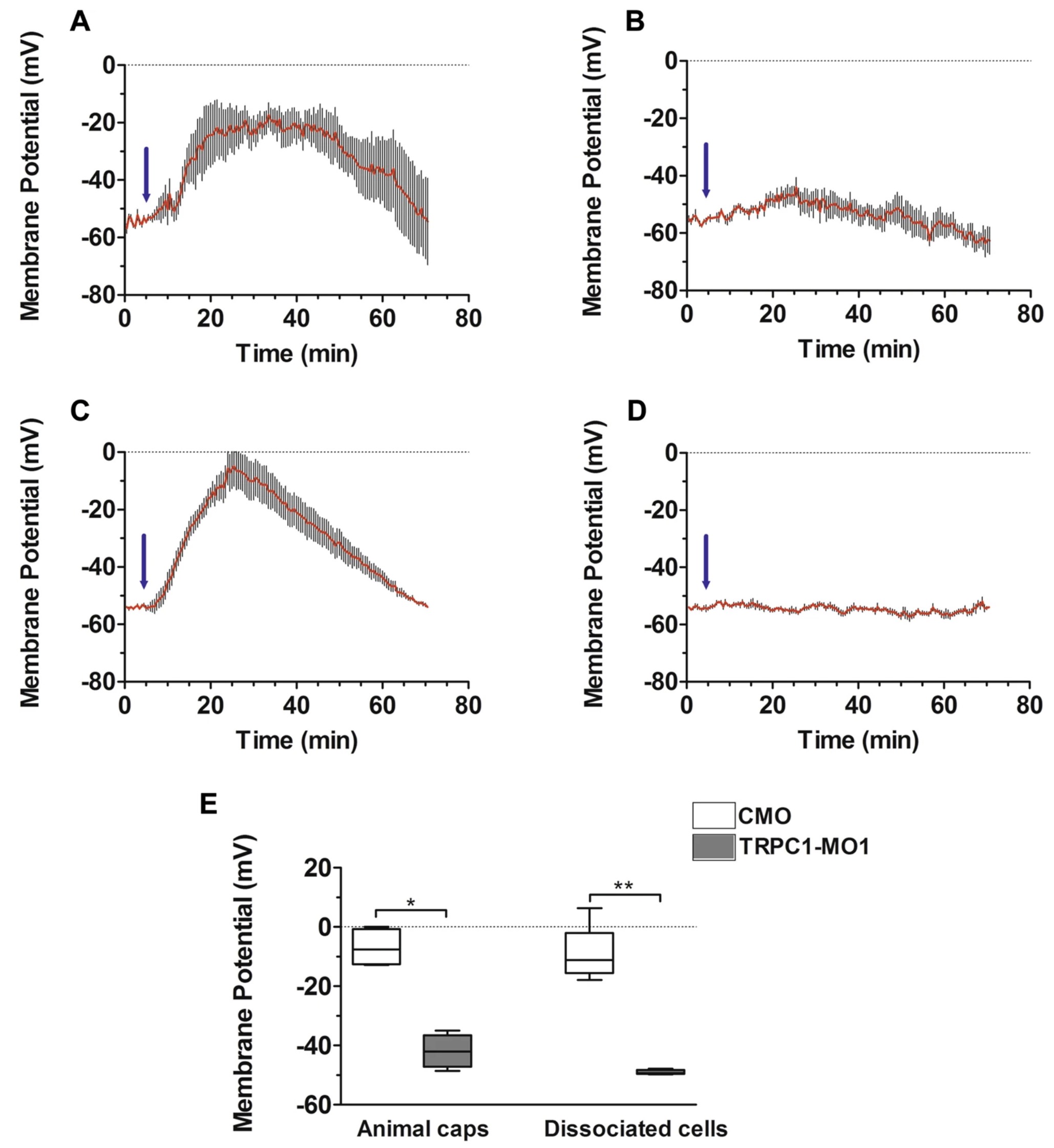 Figure 5. Membrane depolarisation induced by noggin in the ectoderm requires Trpc1. Control morpholino (CMO) or TRPC1-MO1 was injected into both blastomeres of 2-cell stage embryos. Animal caps were then prepared at late blastula (stage 9) and loaded with the potentiometric dye DiBAC4(3). (A,B) The mean calculated membrane potential revealed membrane depolarisation following the addition of noggin (3 µg/mL, see blue arrow) in animal caps prepared from (A) CMO- or (B) TRPC1-MO1-injected embryos (nâ=â4 for each). (C,D) The mean calculated membrane potential in isolated ectoderm cells (nâ=â5 cells) that were dissociated from animal caps prepared from (C) CMO- or (D) TRPC1-MO1-injected embryos. (E) A box plot showing the maximal depolarisation values reached after noggin stimulation of animal caps or dissociated ectoderm cells prepared from CMO-injected embryos (white bars) or TRPC1-MO1-injected embryos (grey bars). The maximal depolarisation values for the animal caps and dissociated cells prepared from CMO- and TRPC1-MO1 embryos were significantly different, (Mann-Whitney test with *Pâ<â0.02 for animal cap recordings, and **Pâ<â0.004 for dissociated cell recordings). |