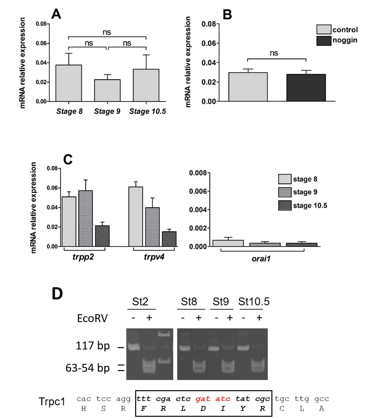 Figure S2: Expression of trpc1, trpp2, trpv4 and orai1 mRNA in X. laevis. (A) RT-qPCR analysis of trpc1 in ectoderm (animal caps) isolated from embryos before gastrulation (stage 8 and stage 9) and at mid-gastrula (stage 10.5). In each case, the level of expression was normalized to the housing keeping gene odc (ornithine decarboxylase). No significant changes in mRNA levels occurred during these 3 developmental stages (one-way ANOVA with Bonferroniâs test, P<0.05). The data represent the mean ± SEM of 7 independent experiments for each of the 3 stages, and 20 animal caps were collected for each experiment. (B) RT-qPCR analysis of trpc1 in control stage 9 animal caps and in noggin-treated stage 9 animal caps. In each case, the level of expression was normalized to the housing keeping gene odc (ornithine decarboxylase). When compared with the control animal caps, no significant changes in trpc1 mRNA levels occurred in the noggin-treated animal caps (MannWhitney t-test). The data represent the mean ± SEM of 9 independent experiments, with 20 animal caps in each experiment. (C) RT-qPCR analysis of trpp2, trpv4 and orai1 in ectoderm (animal caps) isolated from embryos before gastrulation (stage 8 and stage 9) and at mid-gastrula (stage 10.5). In each case, the level of expression was normalized to the housing keeping gene odc (ornithine decarboxylase). The data represent the mean ± SEM of 5 independent experiments for each of the 3 stages with 20 animal caps per experiment. (D) Early embryos and animal caps express the long trpc1 isoform. EcoRV treatment of trpc1-PCR products systematically cleaved the 117-bp amplicon into 2 fragments of 63 bp and 54 bp as shown on the polyacrylamide gel. This was shown in maternal stage (Stage 2; St2) embryos as well as in animal caps at blastula (St 8 and St9) and gastrula (St 10.5). The sequence shows that the amplicon exhibits a conserved EcoRV site (in red), in the 21bp-longer isoform (bold in box). The full-length gels are presented in supplementary figure S8. |