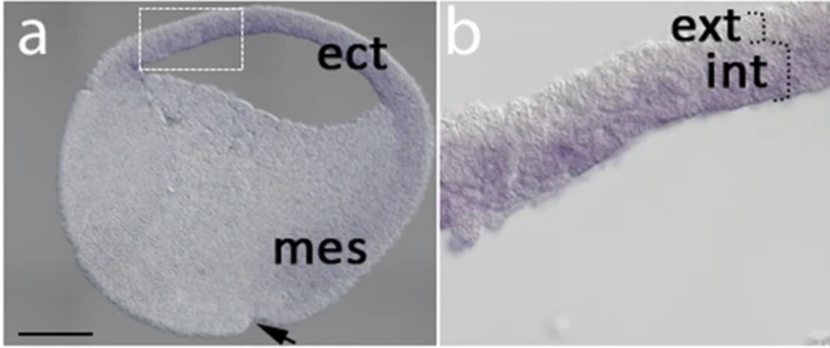 cacna1c (calcium channel, voltage-dependent, L type, alpha 1C subunit ) gene expression in bisected Xenopus laevis embryo, assayed via in situ hybridization. NF stage 10 (a) and in higher magnification (b) . Key ect= ectoderm, mes= dorsal [endo]mesoderm and ext/int = outer versus inner layer of animal cap ectoderm. |