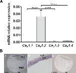 Figiure 1. Expression of CaV1.2 mRNA in X. laevis. (A) RT-qPCR analysis of Cav1.1, Cav1.2, Cav1.3 and Cav1.4 in ectoderm (animal caps) isolated before gastrulation at stages 8 and 9. The expression levels were normalized to the housing keeping gene odc (ornithine decarboxylase). The level Cav1.2 mRNA was significantly higher than that of Cav1.1, Cav1.3 and Cav1.4 (one way ANOVA with Bonferroniâs test, ****Pâ<â0.0001). The data represent meanâ±âSEM of 9 independent experiments such that 20 animal caps were used for each experiment. (B) In situ hybridization to show the pattern of localization of CaV1.2 mRNA in sections acquired at early gastrula (stage 10). (Ba) Photomicrograph of a sagittal section labelled with the anti-sense probe, which shows CaV1.2 expression in the ectoderm (ect) and dorsal mesoderm (mes). There is no CaV1.2 expression in the ventral mesoderm. (Bb) Higher magnification view of the ectoderm (corresponding to the white dashed rectangle in panel (Ba), which shows that CaV1.2 is expressed in the internal layer (int) but not in the external layer (ext). (Bc) Photomicrograph of a sagittal section showing no labelling with the sense probe. In (Ba-Bc), dorsal is to the right and the arrows indicate the dorsal blastopore groove. Scale bars are 300 µm. |