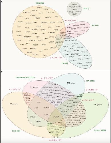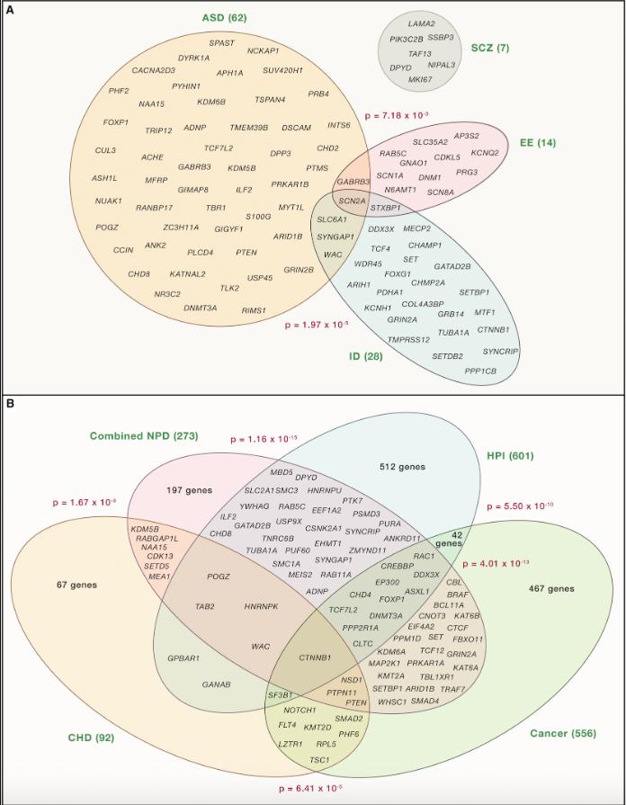 Figure 3. Neuropsychiatric Disorder Genes Overlap with Other Disorders and Initiatives (A) Risk genes, identified from de novo variants, overlap across NPDs. We utilized a common pipeline to identify high confidence genes (false discovery rate [FDR] <0.1) for autism spectrum disorders (ASD), intellectual disability (ID), epileptic encephalopathies (EE), schizophrenia, (SCZ), Tourette disorder (TD), and obsessive-compulsive disorder (OCD) (Table S1). We considered de novo variants from whole exome sequencing studies only and leveraged TADA to estimate FDRs (He et al., 2013). We omitted targeted sequencing studies in order to generate a fair âexome-wideâ comparison across disorders and focused on de novo coding variants only as non-coding variants are outside of the scope of this review. NPDs with 5 or more high confidence risk genes are shown (i.e., TD and OCD are excluded), and the sizes of the ovals are proportional to the number of genes identified for each disorder (total number in parentheses). ASD and ID as well as ASD and EE strongly overlap. Each p value is corrected for multiple comparisons. Some of these studies excluded probands with co-morbid NPDs. For example, in the EE studies, probands with moderate-to-severe developmental impairment, or diagnosis of autism or pervasive developmental disorder before the onset of seizures were excluded. Therefore, the observed overlaps may underestimate the extent of shared genetic etiology. Similarly, we identified these genes solely based on de novo (rare) variants. Hence, the well-documented genetic overlap at the common variant level is not reflected here. (B) NPD genes, identified from de novo variants, overlap with other disorders and initiatives. Using the same methods as in (A), we identified risk genes for congenital heart disease (CHD). We also generated a combined list of NPD genes, corresponding to the unique set of genes from pooling (A) with the set of genes identified from analyzing the deciphering developmental disorders (DDD) studies (Table S1), which examine developmental disorders collectively. The DDD genes were omitted from (A) because many of the NPDs are represented in this cohort and therefore the relevance of overlap is unclear. Finally, we derived a list of cancer genes from the Cancer Gene Census (Futreal et al., 2004) and Host-Pathogen Interaction (HPI) genes from the HPIDB 2.0 database (Ammari et al., 2016) (Table S1; Data S1). High confidence NPD genes significantly overlap with each of the other three gene sets (Tables S2 and S3) suggesting strong synergy between NPD initiatives and the Cancer Cell Map Initiative (CCMI), the Host Pathogen Map Initiative (HPMI), and similar efforts in CHD. |