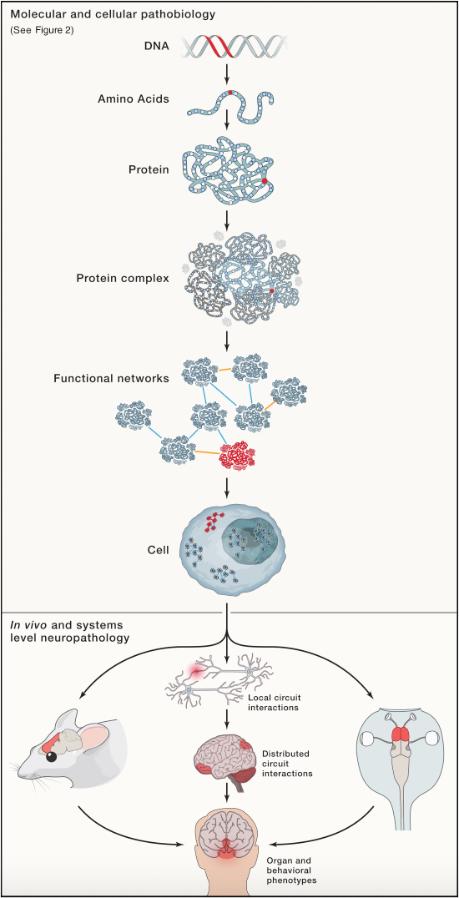 Figure 1. Levels of Pathogenesis and Analysis This figure outlines the different levels on which a disorder could manifest or be investigated, starting from a genetic variant (displayed in red). It includes future parallel investigation in both in vitro and in vivo model systems across levels of complexity (.e.g. human induced pluripotent stem cells, Xenopus tropicalis tadpoles, mice, etc.). While much headway has been made in characterizing the genetic architecture of neuropsychiatric disorders, many of the other levels of analysis remain poorly understood. The “bottom-up” approach discussed here targets the basic levels of this hierarchy, building a strong foundation for the translation of genetics to a higher level of biological understanding. “Top-down” and “middle-out” approaches will be critical as well. |