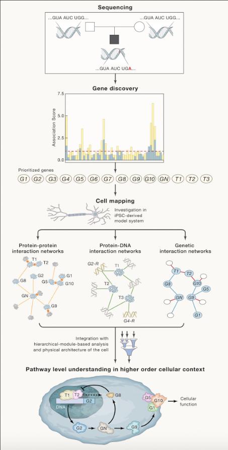 Figure 2. Conceptual Overview of a Bottom-Up Approach The objective of a âbottom-upâ approach, such as the one depicted here, is to translate genetic findings to specific insights about pathobiology of neuropsychiatric disorders. The first step is the identification of specific genes. To date, the majority of gene-level discoveries have been made through the study of high effect-size de novo variants (top). An example association graph is displayed in the second panel, with contributions from different classes of variants shown per gene (yellow versus blue; e.g., missense versus nonsense variants). G1âG10 represent generic genes or the proteins they encode, and T1âT3 transcription factors. âGNâ represents a novel gene implicated through network analyses. There are three main types of interaction networks that could be mapped: protein-protein interaction (PPI), protein-DNA interaction (PDI), and genetic interaction (GI) networks (middle panels). The PPI networks will identify protein complexes (thick edges) as well as relationships between complexes (thin edges). Similarly, PDI networks would identify connections that correspond to putative regulatory relationships between proteins and DNA regulatory regions of other genes (e.g., âG4-Râ). GI networks would identify functional relationships between genes with directionality (red indicates positive interactions, blue negative interactions). These orthogonal datasets should ultimately be integrated, in the context of a cell, to generate a pathway-level understanding (bottom panel). These hypotheses should then be followed up with cellular phenotyping and validation experiments. |