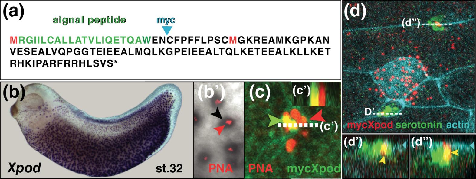 Figure 1. Xpod is expressed in and secreted from SSCs. (a) Xpod amino acid sequence. Translation start sites identified by Yoshii et al. (2011) and in this work marked in red. Signal peptide and cleavage site are indicated in green. (b) Xpod mRNA expression at Stage (st.) 32. (bâ²) Immunofluorescence for SSC marker PNA coâlocalized with Xpod positive cells. (c, d) Mycâtagged Xpod (mycXpod) is secreted via PNA (c) and serotonin (d) loaded granules. Orthogonal views are shown in insets (câ²) and (dâ², dâ³)