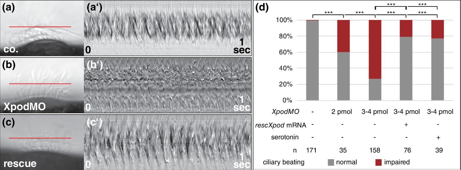 Figure 4. Impaired ciliary beating in Xpod morphants. (aâc) Still pictures of representative control (co.; a), XpodMO (b) and rescue mix (c) injected MCCs, which were subjected to timeâlapse videography. Kymographs (aâ²âcâ²) depicting ciliary motions over time (1 s), which were generated by the optical orthogonal section at the level indicated by the red line in (aâc). Untreated MCC (aâ²) showed a fast motion of multiple cilia. Xpod morphant MCC (bâ²) showed reduced ciliary motion, which can be deduced from cilia keeping their position over time. Coâinjecting XpodMO and rescXpod mRNA restored ciliary beating (câ²). Statistical analyses of analyzed MCCs (d) demonstrate concentrationâdependent XpodMO effects (2 pmol vs. 3/4 pmol/embryo) and MOâspecificity, as shown by coâinjecting rescXpod mRNA. Note, exogenous serotonin administration restored ciliary motion in Xpod morphants. See Table S1 for p values