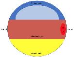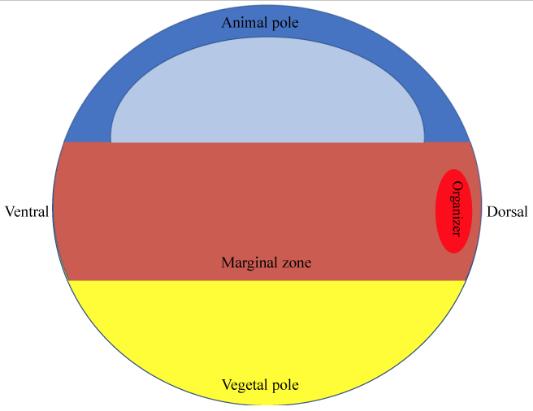 Figure 1. Diagram of Xenopus laevis embryo during early gastrulation. During gastrulation, the three primary germ layers, endoderm, mesoderm, and ectoderm, begin to differentiate. The vegetal pole refers to the lower hemisphere of the embryo and will give rise to the endoderm. The marginal zone refers to the equatorial region of the embryo between the animal and vegetal poles and will give rise to the mesoderm. The mesoderm contains a dorsal organizer region which secretes Bone Morphogenetic Protein (BMP) antagonists. The animal pole refers to the upper hemisphere of the embryo which will give rise to the ectoderm. The drawing of the cavity in the animal hemisphere depicts the fluid-filled blastocoel. As described in the text of the review, foxI1e, along with many other germ layer-enriched factors, is expressed in the cells of the animal pole. chordin and goosecoid are expressed in the dorsal marginal zone. wnt8 is expressed ventrolaterally and brachyury is expressed throughout the marginal zone. VegT, an activator of nodal and nodal-like genes, is expressed in the cells of the vegetal pole. |