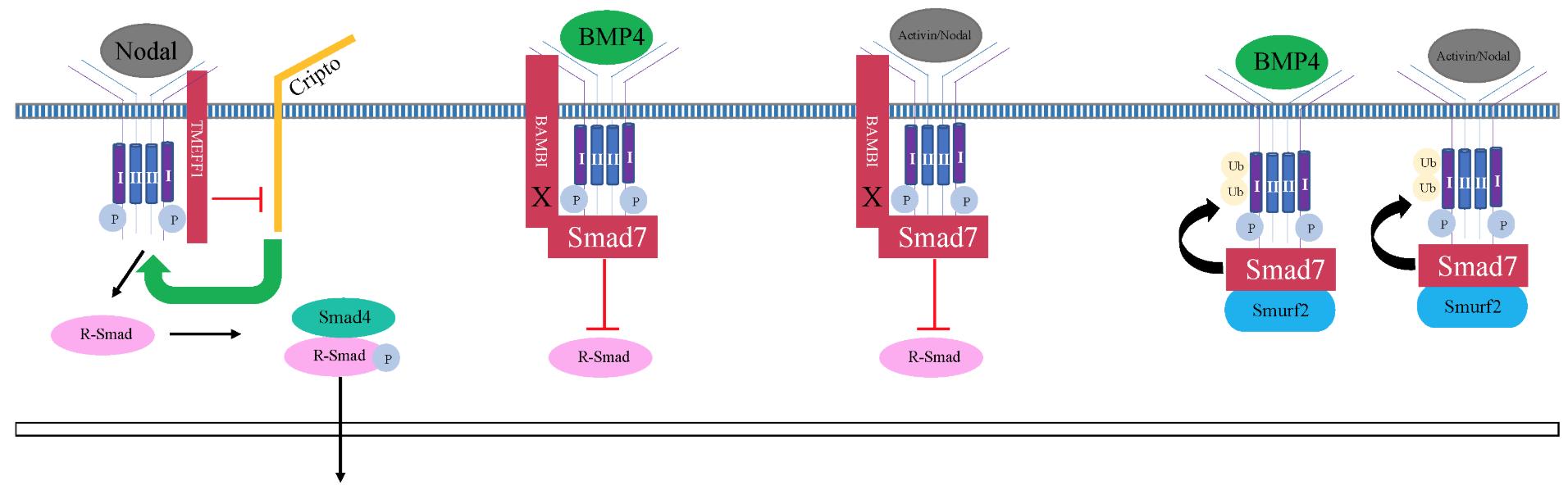 Figure 3. Transmembrane and cytosolic inhibition of mesendodermal gene expression. TMEFF1, a transmembrane protein, prevents the association between Cripto, a Nodal-pathway specific coreceptor, and the type I receptor. Smad7 inhibits TGFβ signaling by forming a complex with Smurf2, which subsequently induces the degradation of the type I and type II TGFβ receptors. BAMBI, another transmembrane protein, associates with Smad7 and the type I receptor and inhibits association between the type I receptor and R-Smads. The âXâ indicates the lack of a serine/threonine intracellular kinase domain. |