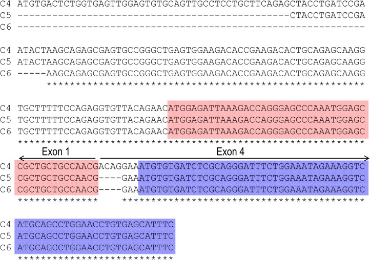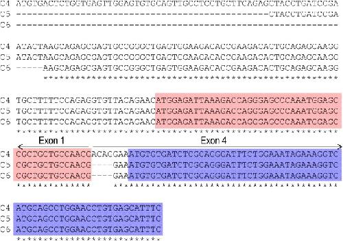 FIGURE 2. Sequence alignment of three partial clones obtained by 5â²-RACE. All three clones of C4, C5, and C6 include exon 1 (encoding âMEIKâ) and exon 4 (encoding âMCDLâ). Clone C4 contains additional 4 nucleotides (nt) âACAGâ at the 5â²-end of exon 4, and thus is predicted to express MCDL-NBCn2. Both clones 5 and 6 contain exon 1 and exon 4 in frame, and thus are predicted to express MEIK-NBCn2. Stars indicate the sequences identical in all three clones. The red boxes indicate the coding region of exon 1 for âMEIKâ