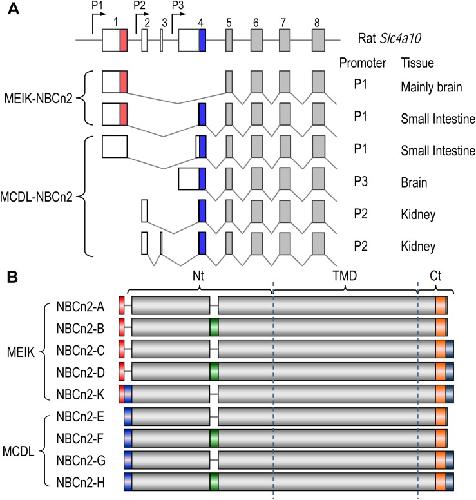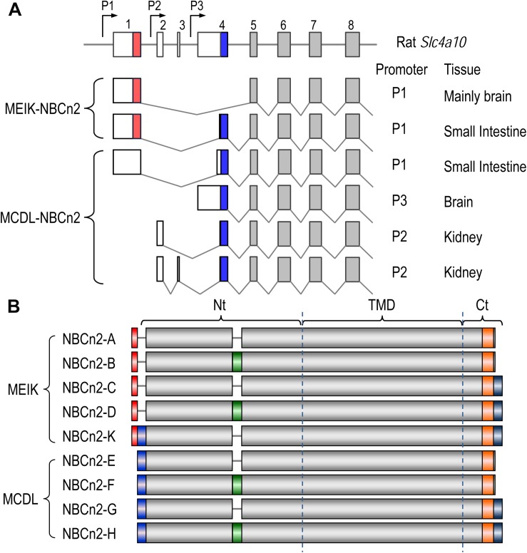 FIGURE 3. Diagrams of partial-exon structures of rat Slc4a10 transcripts and full-length variants of NBCn2. (A) Partial-exon structures of Slc4a10 transcripts. (B) Diagrams of predicted primary structures of full-length NBCn2 variants. Not shown here are two full-length variants identified in mouse NBCn2-I and -J with minor variation at the Ct end, as well as four Nt-truncated NBCn2 variants originally identified from rat kidney (Wang et al., 2015). NBCn2-K is predicted to start with âMEIKâ. However, the NBCn2 in small intestine can be detected with anti-MCDL, but not with anti-MEIK (see text in âDiscussionâ).