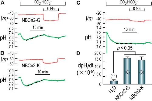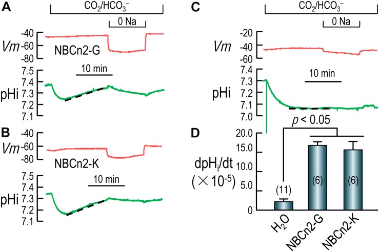 FIGURE 4. Functional characterization of NBCn2 in Xenopus oocytes. (A) Representative recordings of Vm and pHi of an oocyte expressing rat NBCn2-G. (B) Representative recordings of Vm and pHi of an oocyte expressing rat NBCn2-K. (C) Representative recordings of Vm and pHi of a control oocyte injected with H2O. (D) Summary of pHi recovery rate dpHi/dt. The dpHi/dt of both NBCn2-G and NBCn2-K are not significantly different from each other, but both are significantly higher than that of H2O-injected control oocytes by one-way ANOVA analysis followed by Fisherâs comparison. The numerals in the parentheses in panel D indicate the number of individual oocytes included in each bar.