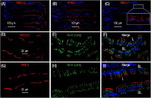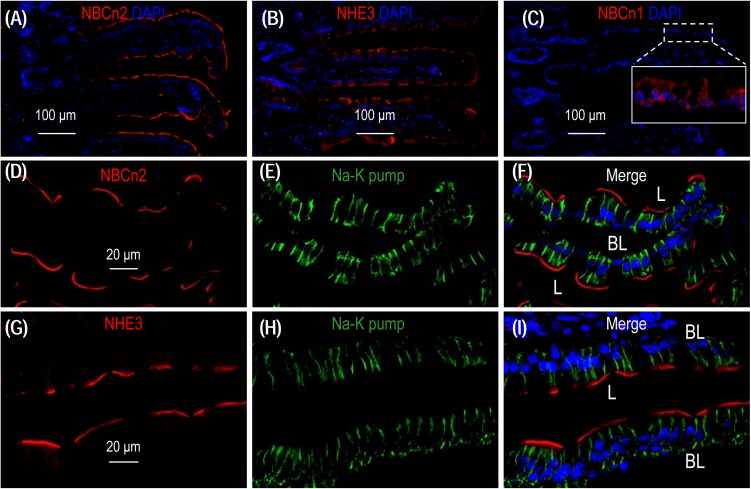 FIGURE 6. NBCn2 and NHE3 are expressed at the apical membrane of epithelium in small intestine. (A) Overview of staining with anti-MCDL (NBCn2) in the small intestine. (B) Overview of staining with anti-NHE3 in the small intestine. (C) Negative staining of anti-NBCn1 in the small intestine. In these experiments, the final concentrations of anti-MCDL, anti-NHE3, and anti-NBCn1 for immunofluorescence staining were 1.5 μg/ml (1:400 dilution). NBCn2 and NHE3 are mainly expressed in the villi of the small intestine. In panel C, no significant staining was observed for anti-NBCn1 when visualized under microscopy with parameters the same as those used for panel A and C. Inset in panel C shows that the non-specific background staining by anti-NBCn1, when visualized by a much higher exposure, is distributed throughout the cytosol of the epithelia. (DâF) High magnification view shows that NBCn2 is exclusively expressed at the apical membrane of small intestine epithelium. (GâI) High magnification view shows that NHE3 is exclusively expressed at the apical membrane of small intestine epithelium. In these experiments, the basolateral membrane is stained by α1 of Na+-K+ pump.