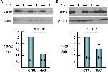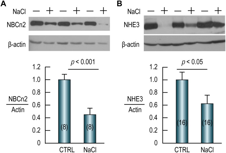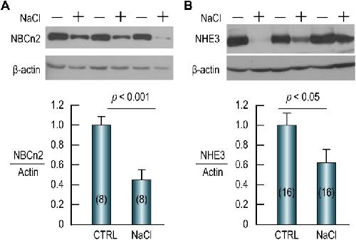 FIGURE 7. High NaCl intake decreases expression of NBCn2 (A) and NHE3 (B) in small intestine of rat. Membrane preparations of the small intestine were used for western blotting to examine the expression of NBCn2 (probed with anti-MCDL) or NHE3. The density of the target transporter in each lane was normalized to that of actin of the same lane. This ratio of each lane was then normalized to the average of the ratios of the control lanes in the same blot. Compared to the control, NaCl treatment decreases the abundance of NBCn2 by 55% and that of NHE3 by 40%. Numerals in the parenthesis indicate the numbers of rats included in each condition. For statistical comparison, two-tailed studentâs t-test was performed. âââ indicates the controls, whereas â+â indicates the rats treated with NaCl.
