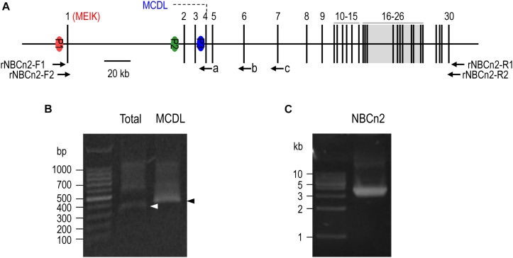 FIGURE 1. 5â²-RACE and RT-PCR analysis of Slc4a10 expression in small intestine of rat. (A) Diagram of structure of rat Slc4a10 gene. Rat Slc4a10 contains 30 exons and three promoters: promoter P1 (upstream of exon 1), P2 (located in the intron between exons 1 and 2), and P3 (located in the intron between exons 3 and 4). Exon 1 contains the coding sequence for unique Nt of MEIK-NBCn2. Exon 4 contains the coding sequence for the unique Nt of MCDL-NBCn2. Exons 6-26 boxed in gray encode the transmembrane domain of NBCn2. (B) Agrose gel analysis of 5â²-RACE of Slc4a10 from small intestine. (C) Agrose gel analysis of RT-PCR product of full-length Slc4a10 transcripts from small intestine. Arrows a, b, and c in panel (A) indicate the approximate positions of the primers used for 5â²-RACE. Arrowheads in panel (B) indicate the target bands of PCR products of Slc4a10.