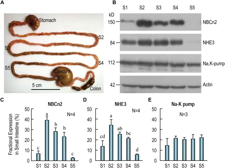 FIGURE 5. Distribution of NBCn2, NHE3, and Na+-K+ pump in different segments of rat small intestine. (A) Image showing the tissue collection sites for different fragments of the small intestine. S1, duodenum; S2, proximal jejunum; S3, middle jejunum; S4, distal jejunum; S5, ileum. Scale bar, 5 cm. (B) Western blotting of NBCn2 (with anti-MCDL), NHE3, and Na+-K+ pump in segments S1-S5 of the small intestine. β-actin is used as loading control. (C) Fractional distribution of NBCn2 in S1-S5. (D) Fractional distribution of NHE3 in S1-S5. (E) Fractional distribution of Na+-K+ pump in S1-S5. The density of NBCn2 was normalized to that of actin of the same lane from blots like those shown in panel (B). The fractional distribution of NBCn2 in each segment was computed by dividing this normalized density by the sum of the normalized densities of S1-S5. The fractional distribution of NHE3 and Na-K pump was computed by a similar approach. Ns in panels CâE indicate the number of rat individuals included in each panel. One-way ANOVA followed by Fisherâs comparison was used for statistical analysis. P < 0.05 is considered significantly different. Bars not marked by a same alphabet are significantly different from each other.