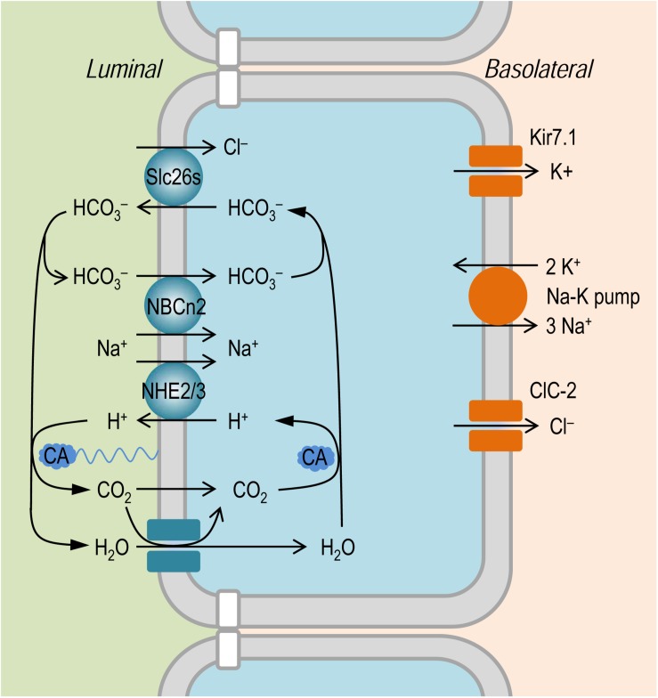 FIGURE 8. Model to show the hypothetical role of NBCn2 in small intestine epithelium. In the apical membrane, NHEs (e.g., NHE2 and NHE3) in concert with SLC26 transporters mediate NaCl absorption. The NaCl absorption via this pathway involves the action of carbonic anhydrase (CA) in both the luminal side and the cytosol. The presence of NBCn2 in the apical membrane likely provides an alternate pathway for the absorption of Na+ and the direct uptake of luminal HCO3â. In the basolateral membrane, NaCl extrusion is mediated by the coupled action of Na+-K+ pump and Clâ channel ClC-2 (Lipecka et al., 2002; Pena-Munzenmayer et al., 2005). Kir7.1 expressed in the basolateral membrane provides a pathway for the cycling of K+ (Partiseti et al., 1998; Nakamura et al., 1999).