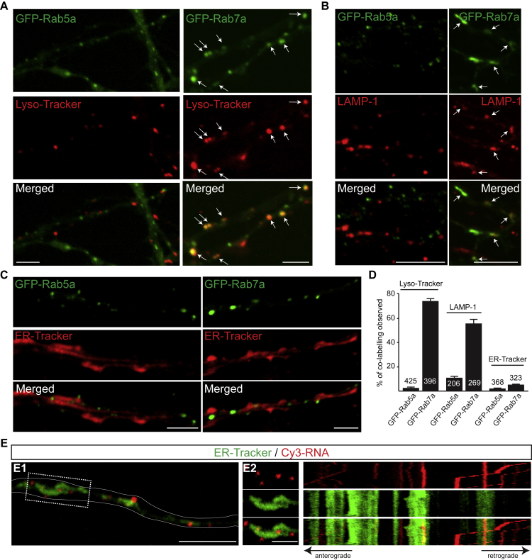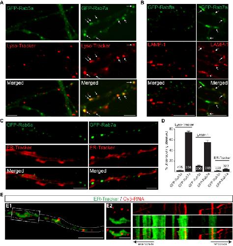Figure S1. Spatial Relationship between Early Endosomes, Late Endosomes, the ER, and Cy3-RNA Granules in Cultured RGC Axons, Related to Figure 1(A) GFP-Rab5a endosomes do not colocalize with Lyso-Tracker-labeled vesicles in distal axons (left). GFP-Rab7a endosomes colocalize with Lyso-Tracker-labeled vesicles (right, white arrows).(B) GFP-Rab5a endosomes do not colocalize with LAMP-1-associated vesicles in distal axons (left). GFP-Rab7a endosomes colocalize with LAMP-1-associated vesicles (right, white arrows).(C) GFP-Rab5a and GFP-Rab7a endosomes are in close contact with ER-Tracker-labeled axonal ER, but they are structurally distinct.(D) Percentage of GFP-Rab5a or GFP-Rab7a endosomes co-labeled with Lyso-Tracker, LAMP-1 or ER-Tracker.(E) Cy3-RNA granules are closely associated with ER-Tracker-labeled axonal ER (left). Kymograph of the axon segment indicated by the dotted outline (middle) shows little co-movement of the two signals (right). n, number of axon segments. Mean ± s.e.m. Scale bars: 5 μm in A, B, C, D, E1; 2 μm in E2. |