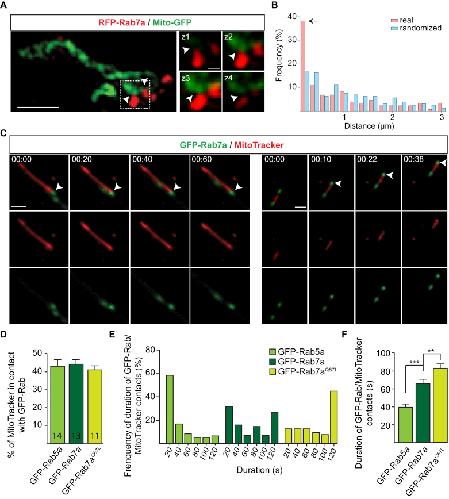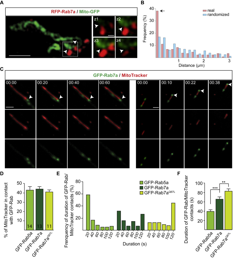 Figure S5. Endosomes and Mitochondria Form Contacts in RGC Axons, Related to Figure 3(A) Representative super-resolution microscopy images showing the close proximity between RFP-Rab7a endosomes and mitochondria (Mito-GFP) in RGC axons. Images in z-stacks showing the close proximity between the two signals in the Z-plane. Arrowheads indicate the close proximity between the two signals.(B) Distribution of distances between real or randomly distributed RFP-Rab7a endosomes and mitochondria (Mito-GFP). The distance of each endosome with its nearest mitochondria is shown as a fraction of the total number of endosomes. The arrow indicates that the largest number of endosomes lie between 0-200 nm of the closest mitochondria (n=188 endosomes in 21 axons).(C) Examples of time-lapse sequences showing the contact between GFP-Rab7a endosomes and mitochondria (MitoTracker) in RGC axons.(D) Percentage of GFP-Rab5a or GFP-Rab7a endosomes contacting mitochondria for more than 10 seconds over 2-minute recording (n=number of axon segments).(E and F) Duration of endosome-mitochondria contacts over 2-minute recording (n=77 (GFP-Rab7a), 60 (GFP-Rab5a), 63 (GFP-Rab7aQ67L) contacts). Mean±s.e.m.; n.s., not significant, âââP<0.001, Mann-Whitney test. Scale bars: 1μm (left panel) or 200nm (z-stacks) in A; 2.5μm in C. Time stamps are in the format of min:sec. |