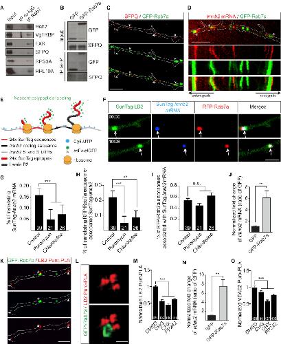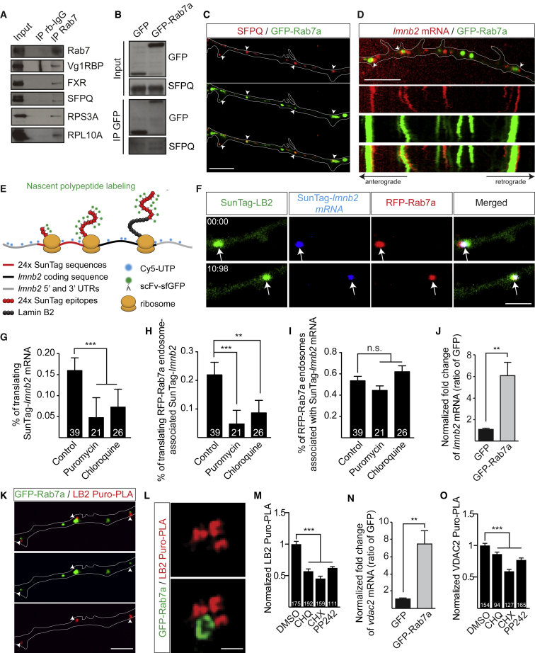 Figure 4. mRNAs Essential for Mitochondrial Integrity Are Translated on Rab7a Endosomes in Axons(A) Co-immunoprecipitation (coIP) between Rab7 and Vg1RBP, FXR, SFPQ, RPS3A, and RPL10A in brain lysates.(B) CoIP between GFP-Rab7a and SFPQ in brain lysates.(C) Colocalization of GFP-Rab7a with SFPQ in axons (white arrowheads).(D) RGC axon segment analyzed by live imaging and its corresponding kymograph (1 min), showing the association between Cy5-labeled laminb2 mRNA (lmnb2) and GFP-Rab7a endosomes.(E) Schematic of SunTag system-based nascent polypeptide labeling to visualize Lamin B2 (LB2) synthesis.(F) Representative images showing the nascent SunTag-LB2 protein (green), the SunTag-lmnb2 mRNA (blue), and the RFP-Rab7a endosome (red) in live axons (indicated by white arrows).(G) Percentage of SunTag-lmnb2 mRNA associated with nascent SunTag-LB2 protein (translating) per 50-μm axon segment.(H) Percentage of SunTag-lmnb2 mRNA associated with RFP-Rab7a endosomes colocalized with nascent SunTag-LB2 protein (translating).(I) Percentage of RFP-Rab7a endosomes associated with SunTag-lmnb2 mRNA.(J) Quantitative analysis of lmnb2 mRNA by qRT-PCR of cDNA synthesized from RNAs co-precipitated with GFP and GFP-Rab7a from brain extracts (n = 3 biological replicates).(K) Example of LB2 Puro-PLA signals in proximity to GFP-Rab7a endosomes (white arrowheads) in axons.(L) Super-resolution microscopy analysis of LB2 Puro-PLA signals next to a GFP-Rab7a endosome.(M) Quantification of LB2 Puro-PLA signals in treated RGC axons.(N) Quantitative analysis of vdac2 mRNA by qRT-PCR of cDNA synthesized from RNAs co-precipitated with GFP and GFP-Rab7a from brain extracts (n = 3 biological replicates).(O) Quantification of VDAC2 Puro-PLA signals in treated RGC axons.N, number of axon segments in (G)â(I), (M), and (O). Mean ± SEM. âp < 0.05, ââp < 0.01, âââp < 0.001, Mann-Whitney test. Scale bars: 5 μm in (C), (D), and (K); 1 μm in (F); and 500 nm in (L). Time stamps are in the format of seconds:milliseconds. See also Video S4. |