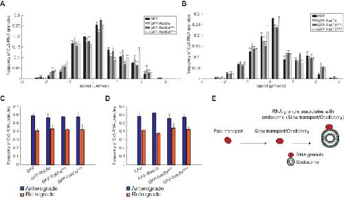 Figure S2. RNA Granule Motions in Axons Expressing Wild-Type or Mutant GFP-Rab5a or GFP-Rab7a, Related to Figure 1(A) Average speed of Cy3-RNA granules in axons expressing GFP, GFP-tagged wild-type Rab5a (Rab5a) or Rab5a mutants (Rab5aQ80L, Rab5aS35N). n=547 (GFP), 1064 (GFP-Rab5a), 695 (GFP-Rab5aQ80L), 524 (GFP-Rab5aS35N) granules.(B) Average speed of Cy3-RNA granules in axons expressing GFP, GFP-tagged wild-type Rab7a (Rab7a) or Rab7a mutants (Rab7aQ67L, Rab7aT22N). n=475 (GFP), 788 (GFP-Rab7a), 657 (GFP-Rab7aQ67L), and 811 (GFP-Rab7aT22N) granules. (A and B) For each of the three biological replicates we calculated a frequency distribution of speeds for the following bins: -2.5 to -2, -2 to -1.5, -1.5 to -1, -1 to -0.5,-0.5 to 0, 0 to 0.5, 0.5 to 1, 1 to 1.5, 1.5 to 2, 2 to 2.5, and 2.5 to 3. For each bin the bar plot represents the mean of the 3 replicates.(C) Proportions of Cy3-RNA granules transported anterogradely or retrogradely in axons expressing GFP as control, GFP-tagged wild-type Rab5a or Rab5a mutants Rab5aQ80L, Rab5aS35N. Data from all repeats are pooled. n=21 (GFP), 18 (GFP-Rab5a, 16 (GFP-Rab5aQ80L), 17 (GFP-Rab5aS35N) axons.(D) Proportions of Cy3-RNA granules transported anterogradely or retrogradely in axons expressing GFP as control (CT), GFP-tagged wild-type Rab7a (WT) or Rab7a mutants Rab7aQ67L, Rab7aT22N. Data from all repeats are pooled. n=17 (GFP), 18 (GFP-Rab7a), 20 (GFP-Rab7aQ67L), 20 (GFP-Rab7aT22N) axons. Mean±s.e.m. |