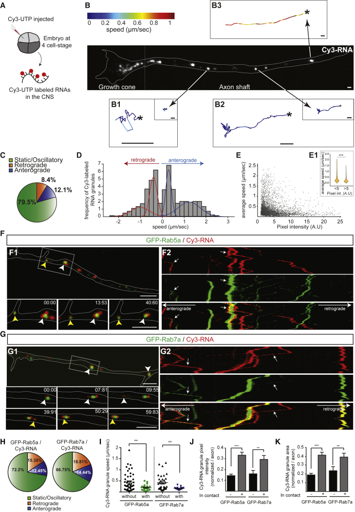 Figure 1. RNA Granules Are Associated with Endosomes in Axons(A) Schematic of labeling endogenous RNAs in the Xenopus CNS.(B) RGC axon shaft and growth cone containing Cy3-RNA granules undergoing oscillatory motions (B1), slow movement (B2), and fast movement (B3). Asterisks show the origin of the tracks. The frame-to-frame speeds are indicated by color code. The tracks are presented first at the same magnification and then at higher magnification for (B1) and (B2).(C) Proportions of axonal Cy3-RNA granules displaying the indicated motion types.(D) Speed distribution from average velocities of moving Cy3-RNA granules showing fast-moving and slow-moving populations in both anterograde (blue) and retrograde (red) directions (Gaussian mixture model). n = 1,022 moving RNA granules in 38 axons.(E) Scatterplot showing individual Cy3-RNA granule speed as a function of fluorescent pixel intensity.(E1) Violin plot showing the speed distribution of Cy3-RNA granules with pixel intensity either more or less than 5 a.u.(CâE) n = 4,995 RNA granules in 38 axons.(F) RGC axon segment showing the association between Cy3-RNA granules (red) and GFP-Rab5a (green) signals (white and yellow arrowheads indicate two different RNA granules) (F1). Also shown are kymographs (1 min) of the axon segment presented in (F1) (F2).(G) RGC axon segment showing the close association between Cy3-RNA granules (red) and GFP-Rab7a (green) signals (white and yellow arrowheads indicate two different RNA granules) (G1). Also shown are kymographs (1 min) of the axon segment presented in (G1) (G2).(H) Proportions of Cy3-RNA granules associated with GFP-Rab5a or GFP-Rab7a displaying the indicated motions (n = 52 [GFP-Rab5a] and n = 56 [GFP-Rab7a] RNA granules).(I) Speed of Cy3-RNA granules moving with or without GFP-Rab5a or GFP-Rab7a endosomes in axon shafts (n = 71 [GFP-Rab5a] and n = 52 [GFP-Rab7a] RNA granules).(J and K) Average pixel intensity (normalized to the brightest pixel within each axon) (J) and area (normalized to the area of the largest granule) (K) of Cy3-RNA granules away from or in contact with GFP-Rab5a or GFP-Rab7a endosomes (n = 192 [GFP-Rab5a] and n = 82 [GFP-Rab7a] RNA granules).Mean ± SEM; ââp < 0.01, âââp < 0.001; Wilcoxon rank-sum test in (E), Mann-Whitney test in (I)â(K). Scale bars, 1 μm in (B) and 5 μm in (F) and (G). Time stamps are in the format of seconds:milliseconds. See also Figures S1 and S2 and Video S1. |
