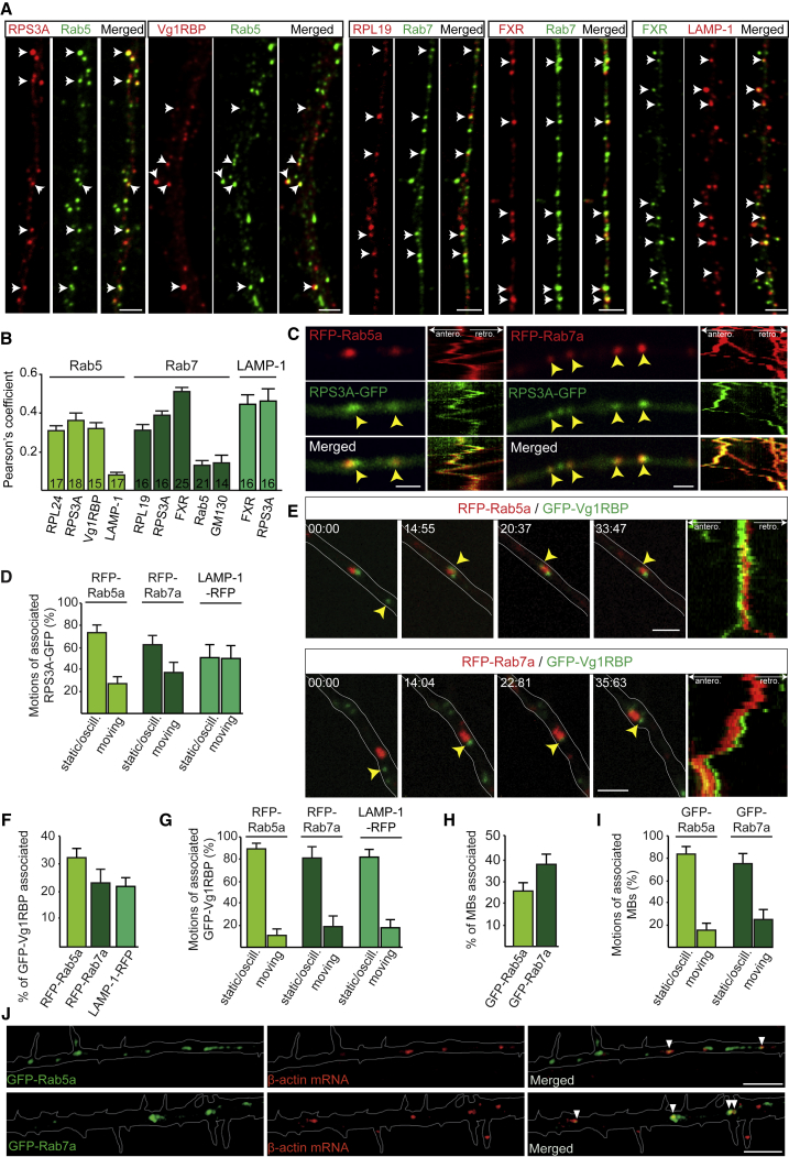 Figure 2. Ribosomes, RNA-Binding Proteins, and mRNAs Localize to Endosomes in Axons(A) Colocalization between endosomal markers and RNA-binding proteins (RBPs) or ribosomal proteins.(B) Pearsonâs coefficient between endosomal markers and RBPs or ribosomal proteins. n, number of axon segments.(C) Time-lapse images and kymographs (1 min) illustrating RPS3A-GFP association with RFP-Rab5a or Rab7a endosomes (yellow arrowheads) in axons.(D) Motion types of RFP-tagged Rab5a (n = 27 axons), Rab7a (n = 29 axons), or LAMP-1 (n = 22 axons) endosomes associated with the RPS3A-GFP signal.(E) Time-lapse images and kymographs illustrating GFP-Vg1RBP association with RFP-Rab5a or Rab7a endosomes (yellow arrowheads) in axons.(F and G) Frequency (F) and motion types (G) of GFP-Vg1RBP associated with RFP-tagged Rab5a (n = 15 axons), Rab7a (n = 13 axons), or LAMP-1 (n = 12 axons) endosomes.(H and I) Frequency (H) and motion types (I) of β-actin molecular beacon (MB) signals associated with GFP-Rab5a (n = 22 axons) or GFP-Rab7a (n = 20 axons) endosomes.(J) Representative images showing β-actin MBs associated with GFP-Rab5a or GFP-Rab7a endosomes (white arrowheads) in axons.Mean ± SEM. Scale bars: 2.5 μm in (A), 2 μm in (C) and (E), and 5 μm in (J). Time stamps are in the format of seconds:milliseconds. See also Figure S3 and Videos S2 and S3. |