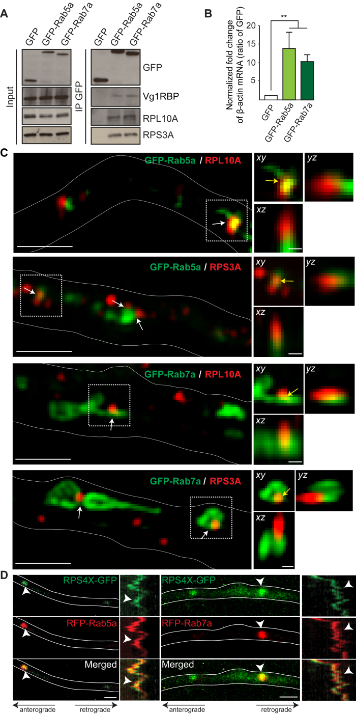 Figure S3. Ribosomes Associate with GFP-Rab5a and GFP-Rab7a Endosomes in Axons, Related to Figure 2(A) Representative Western Blot of Vg1RBP and ribosomal proteins RPL10A and RPS3A co-immunoprecipitated with GFP-Rab5a and GFP-Rab7a in brain lysates.(B) qRT-PCR of cDNA synthesized from RNAs co-precipitated with GFP, GFP-Rab5a and GFP-Rab7a in brain lysates revealing a significant enrichment of β-actin mRNA (n=3 biological replicates).(C) OMX Super-resolution microscopy revealing the presence of RPL10A and RPS3A puncta on GFP-Rab5a or GFP-Rab7a endosomes in axons (left panels, white arrows). Orthogonal views of the indicated areas confirming the contact (yellow arrows) between the ribosomal proteins and endosomes (right panels).(D) Time-lapse images and kymographs illustrating RPS4X-GFP association with RFP-Rab5a or Rab7a endosomes (white arrowheads) in axons. Mean±s.e.m.; ââP<0.01, Mann-Whitney test. Scale bars: 1μm in left panels in C and D; 200nm in right panels in C. |