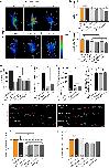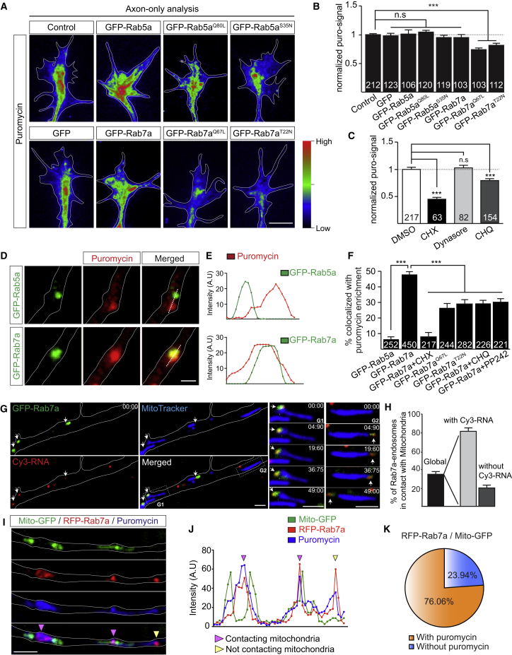 Figure 3. Perturbed Rab7a Activity and Late Endosome Maturation Reduced Intra-axonal Protein Synthesis(A) Heatmaps indicating relative puromycin fluorescence intensity (puro-signal) in somaless RGC growth cones.(B) Quantitative immunofluorescence (QIF) analysis of puromycin incorporation in somaless growth cones expressing the indicated constructs.(C) QIF analysis of puromycin incorporation in somaless growth cones upon acute pharmacological treatments.(D) Nascent proteins labeled by puromycin colocalizing with GFP-Rab7a endosomes but not GFP-Rab5a endosomes.(E) Plotted fluorescent signals across the dotted line in (D).(F) Percentage of GFP-tagged Rab5a-, Rab7a- and Rab7a mutant endosomes colocalizing with puromycin enrichment in axons.(G) Close association of GFP-Rab7a endosomes (green), Cy3-RNA granules (red), and mitochondria (blue) in RGC axons. White arrows indicate Cy3-RNA granules associated with GFP-Rab7a endosomes.(G1 and G2) Examples of time-lapse sequences showing Cy3-RNA granules associated with GFP-Rab7a endosomes next to mitochondria.(H) Percentage of GFP-Rab7a endosomes in contact with mitochondria, 80% of which are associated with Cy3-RNA granules (n = 335 GFP-Rab7a endosomes in 32 axons).(I) RGC axon segments expressing Mito-GFP (green) and RFP-Rab7a (red), in which newly synthesized proteins are visualized using puromycin labeling (blue). The puromycin signal is enriched on RFP-Rab7a endosomes in proximity to mitochondria (pink arrowheads) and distant from mitochondria (yellow arrowhead).(J) Plotted fluorescent signals along the axon segment presented in (I).(K) Percentage of RFP-Rab7a endosomes in contact with mitochondria with or without puromycin enrichment in axons (n = 52 axons).Mean ± SEM; N, number of growth cones in (B) and (C) or number of endosomes in (F). n.s., not significant. âp < 0.05, âââp < 0.001, Mann-Whitney test. Scale bars, 5 μm in (A) and 2 μm in (D), (G), and (I). Time stamps are in the format of seconds:milliseconds. See also Figures S4 and S5. |