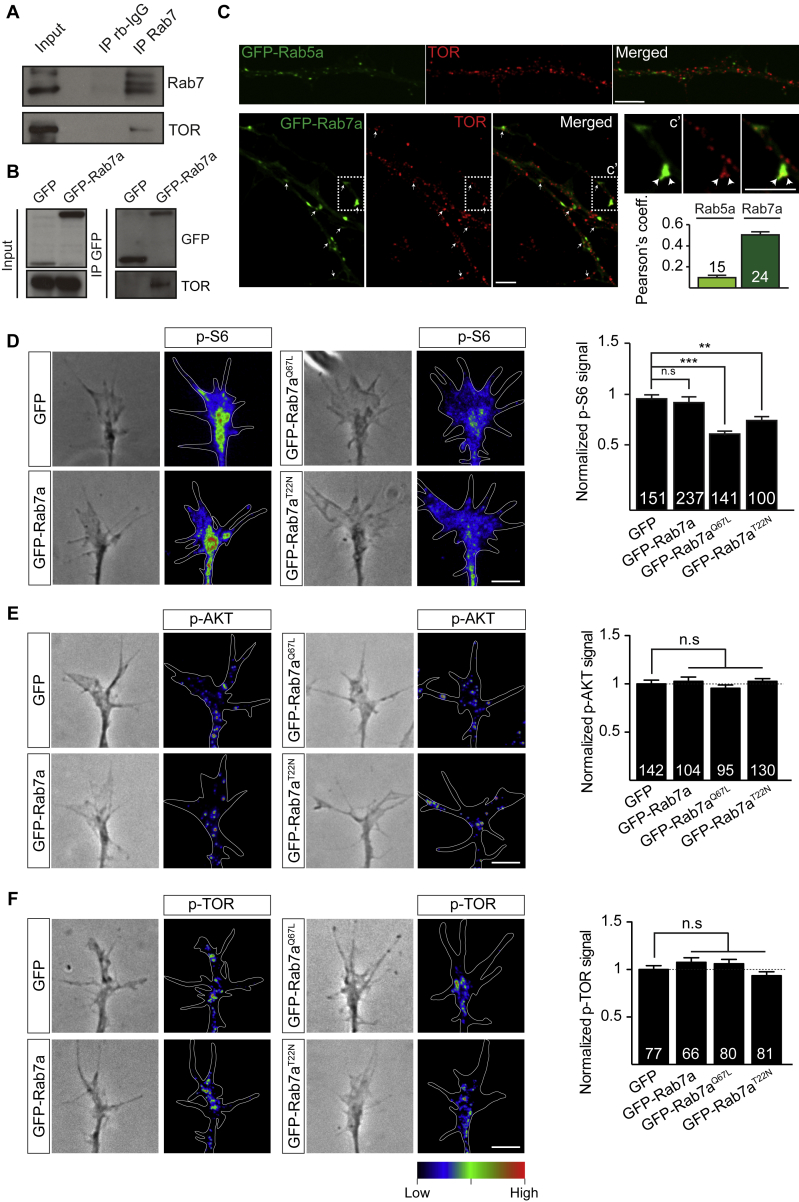 Figure S4. Perturbing Rab7a Function Disrupts Signaling Downstream of TOR Complex 1 in RGC Axons, Related to Figure 3(A) Co-immunoprecipitation between endogenous Rab7 and TOR in brain lysates.(B) Co-immunoprecipitation between GFP-Rab7a and TOR in brain lysates.(C) Representative immunocytochemistry images showing TOR signals in RGC axons expressing GFP-Rab5a or GFP-Rab7a. Pearsonâs coefficient between endosomal markers and TOR.(D) Representative phase contrast images and heat maps indicating relative phospho-S6 levels in growth cones expressing Rab7a mutants. GFP-Rab7aQ67L or GFP-Rab7aT22N expression decreases the amount of phospho-S6 ribosomal proteins in growth cones compared to GFP or GFP-Rab7a-expressing growth cones.(E) Representative phase contrast images and heat maps indicating relative phospho-AKT levels in growth cones expressing Rab7a mutants. GFP-Rab7a, GFP-Rab7aQ67L or GFP-Rab7aT22N expression does not affect the amount of phospho-AKT in growth cones compared to the GFP control.(F) Representative phase contrast images and heat maps indicating relative phospho-TOR levels in growth cones expressing Rab7a mutants. GFP-Rab7a, GFP-Rab7aQ67L or GFP-Rab7aT22N expression does not affect the amount of phospho-TOR in growth cones compared to the GFP control. n=number of axon segments in C, or n=number of growth cones in D, E, F. Mean±s.e.m.; n.s., not significant, ââP<0.01, âââP<0.001, Mann-Whitney test. Scale bars: 5μm. |