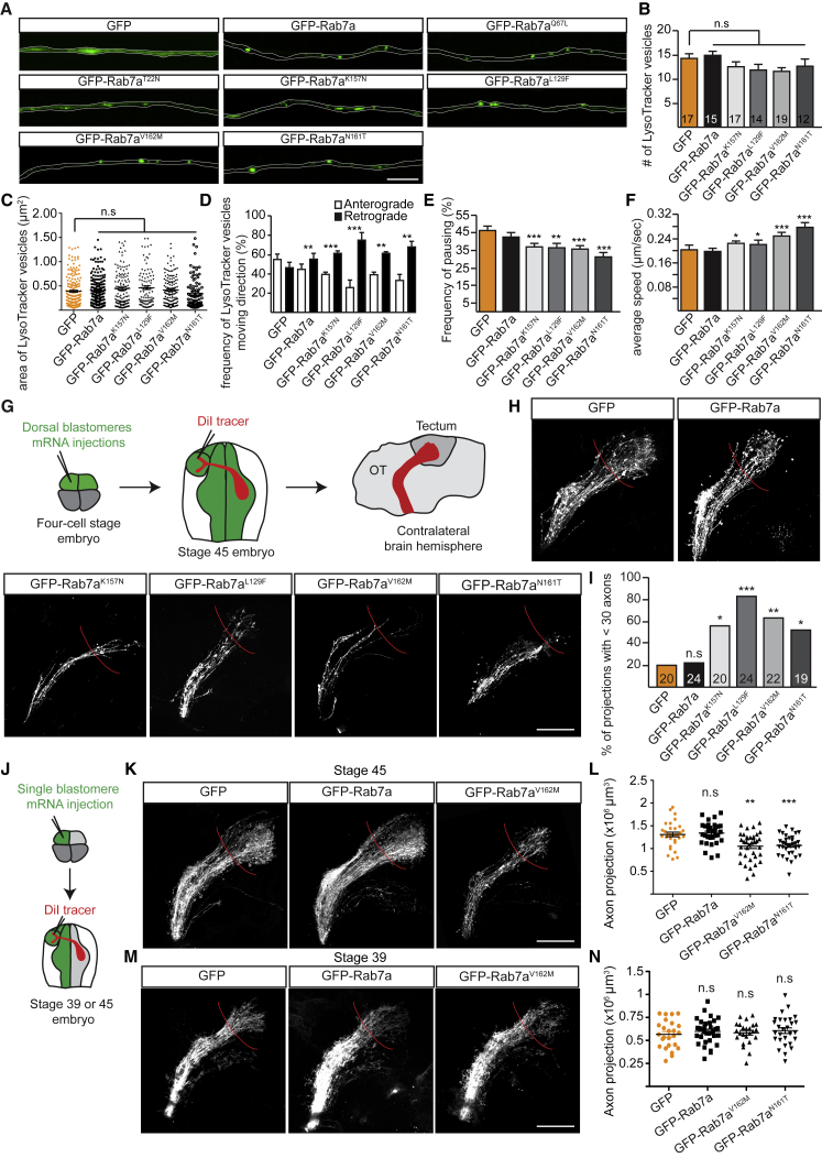 Figure 5. Expression of Rab7a CMT2B Mutants Perturbs Late Endosome Trafficking and Axonal Projection In Vivo(A) Representative images of wild-type or mutant GFP-Rab7a endosomes in cultured axons.(B) Number of LysoTracker-positive vesicles per 50 μm of axon (n, number of axon segments).(C) Area of individual LysoTracker vesicles in axons (n = 180 [GFP], 187 [GFP-Rab7a], 137 [GFP-Rab7aK157N], 97 [GFP-Rab7aL129F], 140 [GFP-Rab7aV162M], 89 [GFP-Rab7aN161T] vesicles).(D) Percentage of LysoTracker vesicles moving anterogradely or retrogradely over a 1-min video (n = 130 [GFP], 114 [GFP-Rab7a], 249 [GFP-Rab7aK157N], 78 [GFP-Rab7aL129F], 155 [GFP-Rab7aV162M], 96 [GFP-Rab7aN161T] vesicles).(E and F) Frequency of pausing (E) and average speed (F) of individual vesicles over a 1-min video (n = 130 [GFP], 114 [GFP-Rab7a], 249 [GFP-Rab7aK157N], 78 [GFP-Rab7aL129F], 155 [GFP-Rab7aV162M], 96 [GFP-Rab7aN161T] vesicles).(G) Schematic of labeling of stage 45 RGC axons in vivo in bilaterally injected embryos. OT, optic tract.(H) Representative images of RGC axon projections in stage 45 embryos expressing GFP, wild-type Rab7a, or CMT2B disease mutants.(I) Percentage of embryos with defective RGC projections with less than 30 axons.(J) Schematic of RGC axon labeling in unilaterally injected embryos.(K) Representative images of RGC axon projections in stage 45 embryos expressing GFP, wild-type Rab7a, or GFP-Rab7aV162M.(L) Axon projection volume post-optic chiasm in stage 45 embryos expressing GFP (n = 31 embryos), wild-type Rab7a (n = 32 embryos), GFP-Rab7aV162M (n = 37 embryos), or GFP-Rab7aN161T (n = 33 embryos).(M) Representative images of RGC axon projections in stage 39 embryos expressing GFP, wild-type Rab7a, or GFP-Rab7aV162M.(N) Axon projection volume post-optic chiasm in stage 39 embryos expressing GFP (n = 25 embryos), wild-type Rab7a (n = 33 embryos), GFP-Rab7aV162M (n = 24 embryos), or GFP-Rab7aN161T (n = 28 embryos).Mean ± SEM. âp < 0.05, ââp < 0.01, âââp < 0.001; Fisherâs exact test in (D) or Mann-Whitney test in (E), (F), (I), (L), and (N). Scale bars, 10 μm in (A) and 100 μm in (H), (K), and (M). |