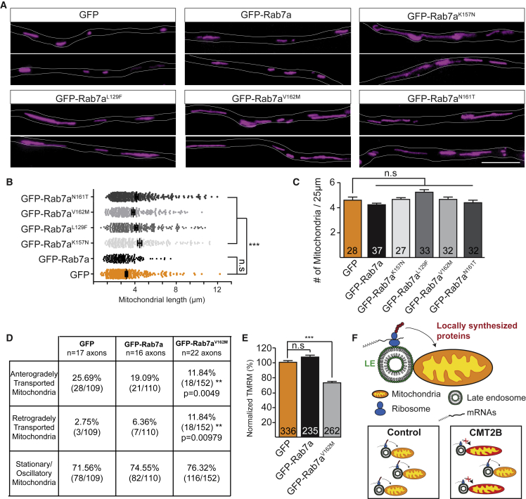 Figure 7. Expression of CMT2B-Associated Rab7a Mutations Compromises Mitochondrial Integrity(A) MitoTracker-labeled mitochondria illustrating variation in mitochondrial morphology in axons expressing GFP-Rab7a CMT2B mutants.(B) Quantification of mitochondrial length (n = 301 [GFP], 148 [GFP-Rab7a], 273 [GFP-Rab7aK157N], 268 [GFP-Rab7aL129F], 225 [GFP-Rab7aV162M], 279 [GFP-Rab7aN161T] vesicles).(C) Quantification of the number of mitochondria within 25-μm axon segments.(D) The percentage of mitochondria transported anterogradely decreases in axons expressing the GFP-Rab7aV162M CMT2B mutant, whereas the percentage of mitochondria transported retrogradely increases compared with the GFP control or GFP-Rab7a-expressing axons.(E) Quantification of mitochondrial membrane potential, measured by TMRM fluorescence intensity, showing a decrease in axons expressing the GFP-Rab7aV162M CMT2B mutant (n = 31 axons) compared with the GFP control (n = 44 axons) and GFP-Rab7a-expressing axons (n = 31 axons).(F) Proposed model. mRNAs and translation machinery associate with late endosomes in axons. Late endosomes in proximity to mitochondria are sites for synthesis of proteins essential for mitochondrial integrity. Late endosome-sited translation is defective in axons expressing CMT2B-associated Rab7a mutants, causing a reduction in mitochondrion-related mRNAs translation.N, number of axon segments in (C); N, number of mitochondria in (E). Mean ± SEM. âââp < 0.001, Mann-Whitney test. Scale bars, 5 μm in (A). |