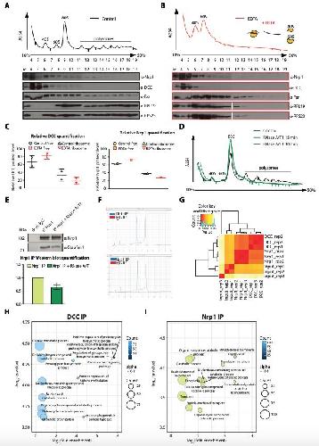 Figure 2 â Figure Supplement 1. Polysome fractionation analysis, RNase sensitivity of Nrp1-Staufen1 interaction and additional RNA-seq analyses. (A) Control and (B) EDTA treated polysome fractions and Western blot showing the distribution of DCC and Nrp1 across fractions. (C) Relative quantification of DCC and Nrp1 protein levels in ribosome-free and ribosomal fractions for control and EDTA-treated samples (DCC control n = 2, DCC EDTA n = 2, Nrp1 control n = 2, Nrp1 EDTA n = 1; Bars indicate mean, errors bars indicate standard deviation). (D) UV absorbance profiles after sucrose density gradient fractionation for control and RNAseA/T1 treated lysates. (E) Western blot analysis and quantification of Staufen1 after Nrp1 pulldowns. (paired t-test; three biological replicates; bars indicate mean, error bars indicate standard deviation; p = 0.0136). (F) Bioanalyzer gel analysis of RNA. (G) Distance matrix showing a high correlation between replicates and a distinct signature between samples. (H) Gene ontology enrichment plot of mRNAs after DCC or (I) Nrp1 pulldowns. |