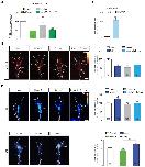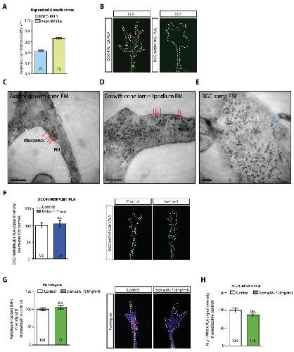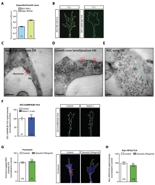Figure 3 â Figure Supplement 1. DCC and Nrp1 are in close proximity to ribosomes in axonal growth cones in a cue-dependent manner. (A) Pearsonâs Correlation coefficients of DCC-RPL5/uL18 and Nrp1-RPS3A/eS1 from expanded axonal growth cones (data obtained from four biological replicates, bars indicate mean, error bars indicate SEM). (B) PLA images showing DCC and RPL10A/uL1 are in close proximity in axonal growth cones, whereas DCC and IgG control generates little to no PLA signal. Scale bars, 5 ïm. (C-E) EM images of an unstimulated axonal growth cone (C), a growth cone lamellipodium (D) and a retinal ganglion cell body (E). Ribosomes can be seen aligned in rows (red arrows) or isolated (white arrow) under the plasma membrane and as polysomes (blue arrows) in the cell body. (F) PLA signal between DCC and hnRNPA2B1 does not decrease after a 2 min Netrin-1 stimulation in axonal growth cones (Mann-Whitney test; bars indicate mean, error bars indicate SEM; p = 0.2886; representative PLA images are shown). (G) Sema3A stimulation at protein-synthesis independent concentration does not decrease puromycin levels in axonal growth cones (Mann-Whitney test; bars indicate mean, error bars indicate SEM; p = 0.2487; representative images are shown) or (H) PLA signal between Nrp1 and RPS3A/eS1 (Mann-Whitney test; bars indicate mean, error bars indicate SEM; p = 0.2555). For all Expansion microscopy, PLA and QIF experiments, numbers in bars indicate amount of growth cones quantified collected from at least three independent experiments. |