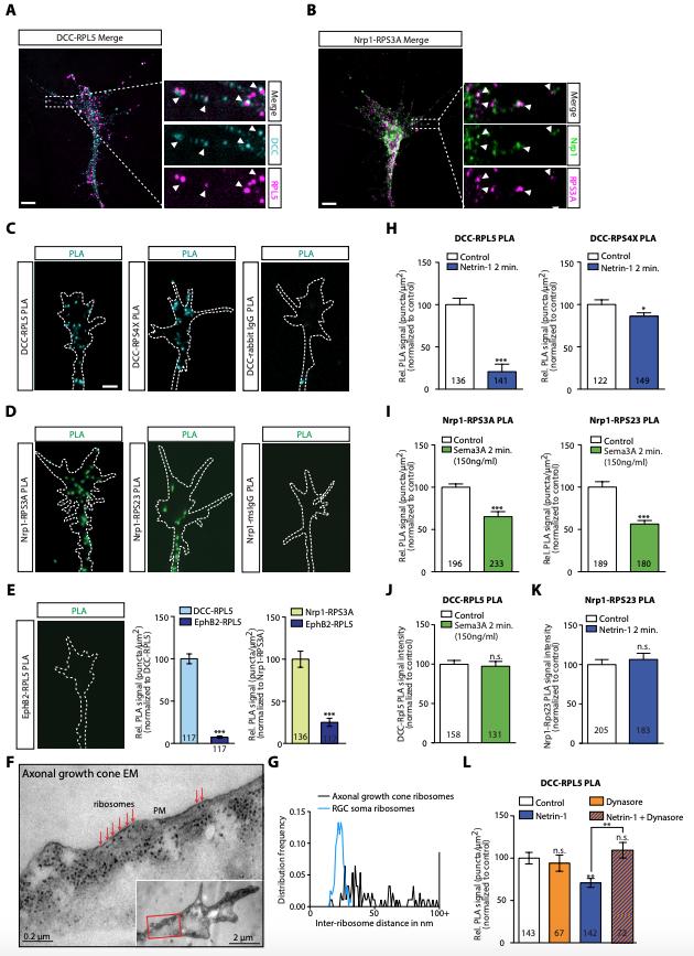 Figure 3. DCC and Nrp1 are in close proximity to ribosomes in axonal growth cones in a cue-dependent manner.(A) Expansion imaging shows partial co-localization of DCC and (B) Nrp1 with ribosomal proteins (Scale bars, 5 μm). (C) Representative proximity ligation assay signal in axonal growth cones between DCC and RPL5/uL18, RPS4X/eS4 or IgG control (Scale bars, 5 μm). (D) Representative proximity ligation assay signal in axonal growth cones between Nrp1 and RPS3A/eS1, RPS23/uS12 or IgG control (Scale bars, 5 μm). (E) Representative PLA signal in axonal growth cones between EphB2 and RPL5/uL18 (left) and quantification of PLA signal in axonal growth cones compared to DCC-RPL5/uL18 or Nrp1-RPS23/uS12 (right) (Mann-Whitney test; three biological replicates; bars indicate mean, error bars indicate SEM, ***p<0.0001; Scale bars, 5 μm). (F) EM image of an unstimulated axonal growth cone showing ribosomes aligned in a row (red arrows) under plasma membrane (PM). Inset shows the growth cone at lower magnification; the red box indicates the area shown in higher magnification. The section glances through the extreme surface of growth cone, where it attaches to the culture dish, giving rise to areas that lack subcellular structure. (G) Distribution frequency of the inter-ribosome distance in nm of ribosomes in axonal growth cones (n = 20) or in RGC soma (n = 5). All distances larger than 100 nm were pooled together. (H, I, J, K) Quantification of PLA signal in cue-stimulated axonal growth cones relative to control (unpaired two-tailed t-test; bars indicate mean, error bars indicate SEM; ***p<0.0001; *p=0.0423; for n.s. in J p=0.3522; for n.s. in K, p=0.885). (L) Relative PLA quantification of DCC and RPL5/uL18 compared to control after Dynasore pre-treatment (50 μM for 20 min), Netrin-1, or Netrin-1 + Dynasore (one-way ANOVA with Bonferroniâs multiple comparisons test; bars indicate mean, error bars indicate SEM; p=0.001027 for Control vs. Netrin-1, p=0.000402 for Netrin-1 vs Netrin-1 + Dynasore, p=0.590377 for Control vs. Dynasore, p=0.384848 for Control vs Netrin + Dynasore). For all PLA experiments, numbers in bars indicate total number of growth cones quantified from at least three independent experiments.Figure 3âsource data 1. Spreadsheet containing PLA counts and relative comparisons from each axonal growth cone in Figure 3E, all inter-ribosome distances and distribution shown in Figure 3G, and all normalized PLA count values for each axonal growth cone in Figure 3HâL.Figure 3âfigure supplement 1. DCC and Nrp1 are in close proximity to ribosomes in axonal growth cones in a cue-dependent manner.(A) Pearsonâs Correlation coefficients of DCC-RPL5/uL18 and Nrp1-RPS3A/eS1 from expanded axonal growth cones (data obtained from four biological replicates, bars indicate mean, error bars indicate SEM). (B) PLA images showing DCC and RPL10A/uL1 are in close proximity in axonal growth cones, whereas DCC and IgG control generates little to no PLA signal. Scale bars, 5 μm. (CâE) EM images of an unstimulated axonal growth cone (C), a growth cone lamellipodium (D) and a retinal ganglion cell body (E). Ribosomes can be seen aligned in rows (red arrows) or isolated (white arrow) under the plasma membrane and as polysomes (blue arrows) in the cell body. (F) PLA signal between DCC and hnRNPA2B1 does not decrease after a 2 min Netrin-1 stimulation in axonal growth cones (Mann-Whitney test; bars indicate mean, error bars indicate SEM; p=0.2886; representative PLA images are shown). (G) Sema3A stimulation at protein-synthesis independent concentration does not decrease puromycin levels in axonal growth cones (Mann-Whitney test; bars indicate mean, error bars indicate SEM; p=0.2487; representative images are shown) or (H) PLA signal between Nrp1 and RPS3A/eS1 (Mann-Whitney test; bars indicate mean, error bars indicate SEM; p=0.2555). For all Expansion microscopy, PLA and QIF experiments, numbers in bars indicate amount of growth cones quantified collected from at least three independent experiments.Figure 3âfigure supplement 1âsource data 1. Spreadsheet containing all Pearsonâs correlation values for each expanded growth cone in Figure 3âfigure supplement 1A, all normalized PLA count values for each axonal growth cone in Figure 3âfigure supplement 1F and H, and all normalized puromycin intensity values for each axonal growth cone in Figure 3âfigure supplement 1G. |
