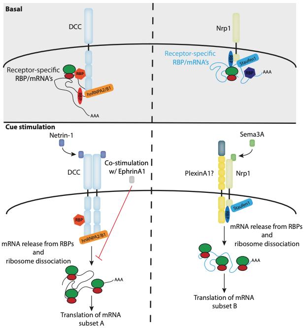 Figure 5. Model diagram depicting the proposed interactions between receptors, RBPs, mRNAs and ribosomes under basal and cue stimulation conditions. |