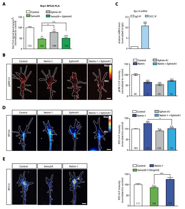 Figure 4 â Figure Supplement 1. EphrinA1 co-stimulation blocks Netrin-1 induced receptor-ribosome dissociation and selective translation of rps14. (A) Relative PLA quantification of Nrp1 and RPS23/uS12 compared to control after Sema3A, EphrinA1, or co stimulation with Sema3A and EphrinA1 (one-way ANOVA with Bonferroniâs multiple comparisons test; bars indicate mean, error bars indicate SEM; *p=0.032078; **p<0.018577; ***p<0.001). (B) pERK1/2 QIF relative to control after Netrin-1, EphrinA1 or Netrin-1 and EphrinA1 co-stimulation (one-way ANOVA with Bonferroniâs multiple comparisons test; bars indicate mean, error bars indicate SEM; ***p<0.0001). (C) Relative mRNA quantification after DCC IP of rps14 mRNA (unpaired t-test with Welchâs corrections on dCT values; three biological replicates; bars indicate mean, error bars indicate SEM; ***p = 0.0003). (D) Rps14 QIF relative to control after Netrin-1, EphrinA1 or Netrin-1 and EphrinA1 co-stimulation (one way ANOVA with Bonferroniâs multiple comparisons test; bars indicate mean, error bars indicate SEM; ***p<0.0001; *p=0.026544). (E) Rps14 QIF relative to control after Netrin-1 or Sema3A stimulation (one-way ANOVA with Bonferroniâs multiple comparisons test; bars indicate mean, error bars indicate SEM; ***p<0.0001; *p<0.05). Scale bars, 5 ïm. For all QIF experiments the numbers in bars indicate amount of growth cones quantified collected from three independent experiments. |