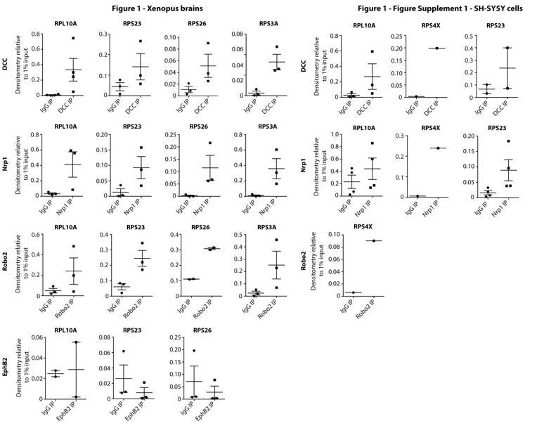 Figure 1—figure supplement 1. Multiple guidance cue receptors interact with ribosomes in SH-SY5Y cells.(A–C) Western blot validation of RP co-immunoprecipitation with DCC, Nrp1 and Robo2 in SH-SY5Y cells. Western blots were repeated 2 to 4 times, Rps4X Western blots are from one experiment, representative examples are shown. (D–E) Relative 18S and 28S ribosomal RNA abundance after control (IgG) pulldowns or receptor pulldowns shows enrichment of rRNA in DCC and Nrp1 IPs in SH-SY5Y cells (unpaired two-tailed t-test; three biological replicates; Bars indicate mean, error bars indicate standard deviation. *p<0.05). |