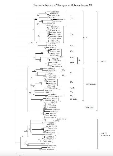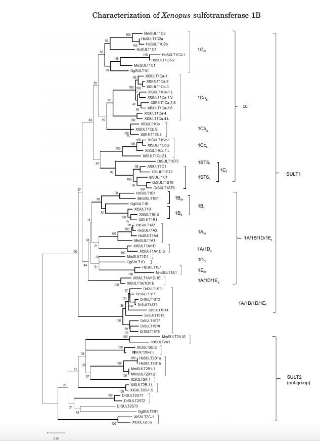 The cytosolic sulfotransferase 1 (SULT1) proteins are a family of highly divergent proteins that show variable expansion in different species during vertebrate evolution. To clarify the evolutionary origin of the mammalian lineage of the SULT1 family, we compiled Xenopus laevis and X. tropicalis SULT1 (XSULT1) sequences from public databases. The XSULT1 family was found to comprise at least six subfamilies, which corresponded in part to five mammalian SULT1 subfamilies but only poorly to zebrafish SULT1 subfamilies. SULT1C was most highly expanded, and could be divided into at least five subfamilies. A cDNA for X. laevis SULT1B (XlSULT1B.S), a homolog of mammalian SULT1B1, was cloned and its recombinant protein was expressed in a bacterial system. XlSULT1B.S, unlike mammalian SULT1B1, was found to be a monomeric protein of ~34 kDa, and displayed sulfonating activity toward 2-naphthol and p-nitrophenol (pNP). However, we could not detect such sulfonating activity toward any endogenous compounds including thyroid hormones, steroid hormones and dopamine, despite the fact that X. laevis and Rana catesbeiana liver cytosols contained sulfonating activity toward most of these endogenous compounds. At optimum pH (6.4), the Michaelis-Menten constant (Km) for pNP was two orders of magnitude greater in XlSULT1B.S (1.04 mM) than in the cytosol preparations (8-15 μM). Our results indicate that Xenopus possesses a prototype of the mammalian SULT1 family, and that XlSULT1B.S showed overall similarities in primary sequence to, and significant differences in molecular and enzymatic properties from, mammalian SULT1B1.