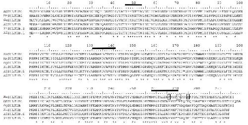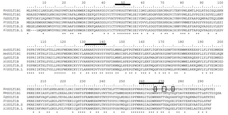 Fig. 2. Alignment of deduced amino acid sequences of Xenopus laevis (Xl) and X. tropicalis (Xt) SULT1B members with human (Hs), mouse (Mm) and chicken (Gg) SULT1B members. Residues that are perfectly conserved among these sequences are marked by asterisks. Two signature sequences (Kakuta et al., 1998), in the N-terminal (for the 5’-phosphosulfate binding site) and middle regions (for the 3’-phosphate binding site), and a conserved sequence in the C-terminal region (Weinshilboum et al., 1997) are represented by horizontal lines above the human sequence. The KTVE dimerization motif overlapping the C-terminal region (Petrotchenko et al., 2001) is boxed in the human sequence.