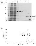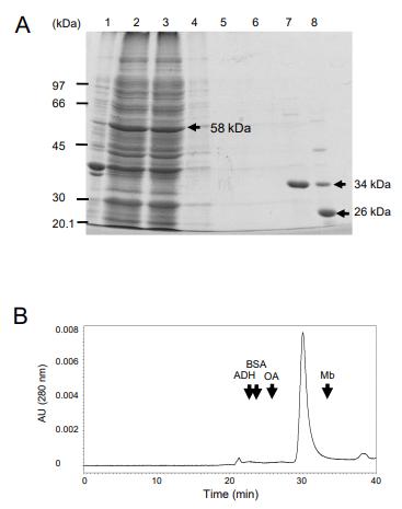 Fig. 4. Molecular size of recombinant XlSULT1B.S. (A) Sodium dodecyl sulfate-polyacrylamide gel electrophoresis (SDS-PAGE) of purified recombinant XlSULT1B.S. Each fraction of the purification steps of recombinant XlSULT1B.S was subjected to SDS-PAGE under reducing conditions on a 10% gel, followed by Coomassie Brilliant Blue staining. Protein samples used were: the bacterial pellet (lane 1) and supernatant (lane 2) after cell lysis, the flow-through fraction (lane 3) and the washing fractions (lanes 4 to 6) of glutathione-affinity chromatography, and the fractions eluted from (lane 7) and still bound to (lane 8) glutathione Sepharose after treatment with PreScission protease. Protein bands of 58, 34 and 26 kDa indicate GST-XlSULT1B.S fusion protein, XlSULT1B.S moiety and GST moiety, respectively. Protein molecular markers: phosphorylase b (97 kDa), BSA (66 kDa), ovalbumin (OA, 45 kDa), carbonic anhydrase (30 kDa) and trypsin inhibitor (20.1 kDa). (B) High-performance size exclusion chromatography on YMC-Pack Diol-120 (500 à 8.0 mm) of purified recombinant XlSULT1B.S. Five microliters of standard proteins (1 mg/ml) or 10 μl of XlSULT1B.S (1.3 mg/ml) in the elution fraction of glutathione-affinity chromatography were applied to the column and then run through in 50 mM TrisHCl, pH 7.0, 200 mM NaCl, at 0.5 ml/min at 25 °C. Ordinate shows absorbance at 280 nm. Molecular weight markers used are described in Materials and Methods. The peak at around