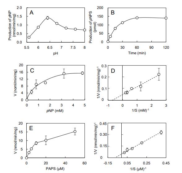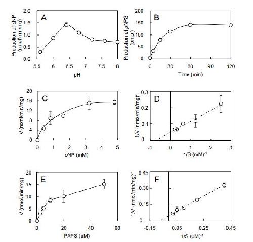 Fig. 5. Sulfonating activity of XlSULT1B.S with p-nitrophenol (pNP). (A) pH dependency of the sulfonating activity of XlSULT1B.S. The enzyme assays were performed with 0.4 mM pNP and 20 μM 3â-phosphoadenosine-5â-phosphosulfate (PAPS) using 100 mM phosphate buffers at different pH (KH2PO4-Na2HPO4, at pH 5.6, 6.0, 6.4, 6.8, 7.2, 7.6 and 8.0). (B) Time course of the sulfonating activity of XlSULT1B.S. The enzyme assays were performed with 0.4 mM pNP and 20 μM PAPS using 100 mM phosphate buffer, pH 6.4, for 0, 5, 15, 30, 60 and 120 min. (C, D) pNP-dependent sulfonating activity of XlSULT1B.S and the LineweaverâBurk double-reciprocal plot. The enzyme assays were performed with 50 μM PAPS in 100 mM phosphate buffer, pH 6.4, for 10 min. Concentrations of pNP