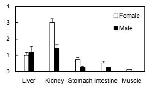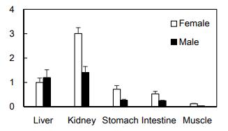 Fig. 3. Transcript levels of xlsult1b.s in five tissues of X. laevis. Total RNA was extracted from tissues of adult females (n = 2) and males (n = 2), reverse transcribed using random primers and then amplified by real-time PCR. Relative expression levels for xlsult1b.s were normalized against the rpl8 expression level, and set at 1.0 in the female liver. Data for each tissue represent the mean ± SD in four assays (four RNA preparations from two animals).