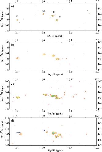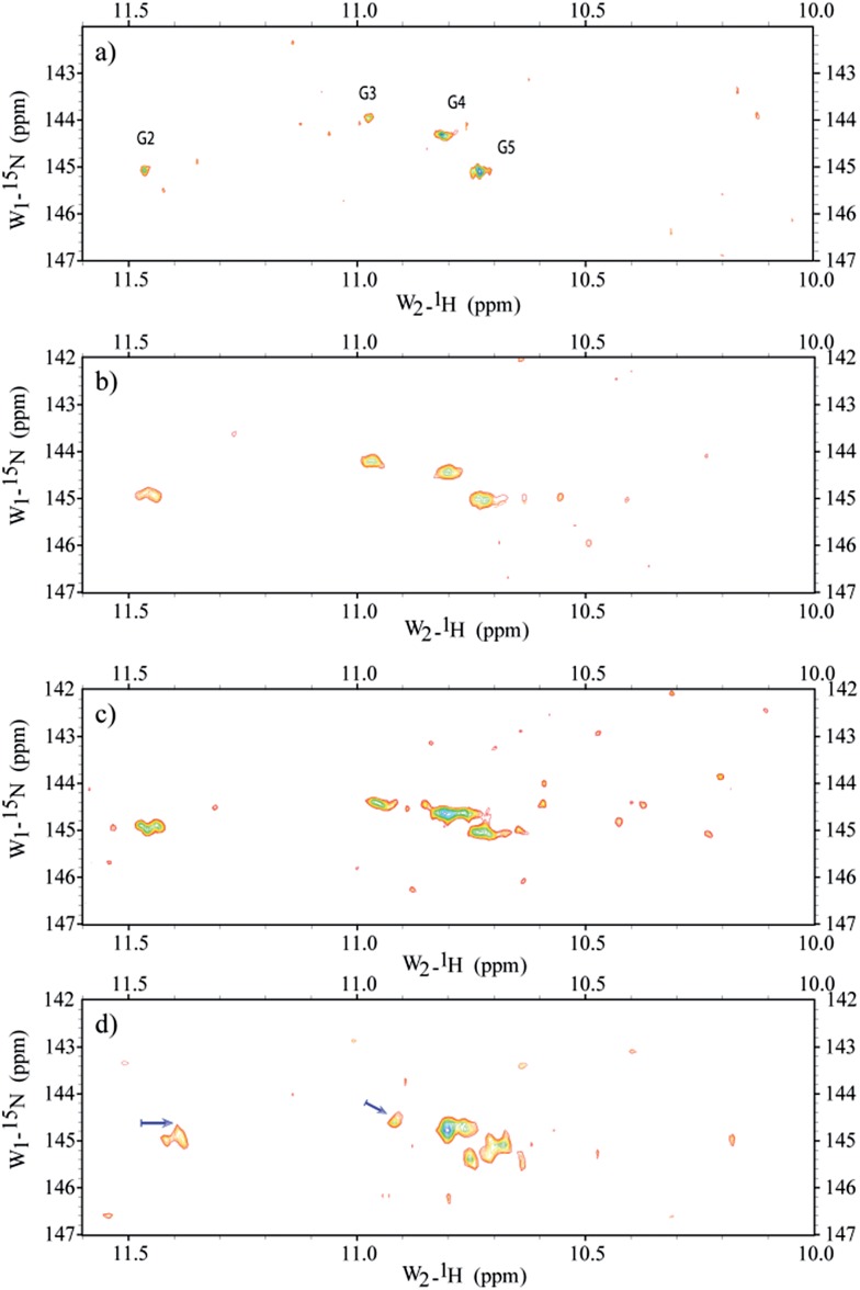 Fig. 2. Time spectral evolution of d(TG4T)4 inside Xenopus oocytes. Spectra obtained after a period of 8 h (a), 16 h (b), 26 h (c) and 32 h (d) from assembly of ∼200 oocytes in the NMR tube. The sample buffer surrounding the oocytes inside the NMR tube was replaced every ∼12 h with a fresh solution, and a spectrum of the buffer where the oocytes were resuspended was measured under the same conditions as the control. All controls revealed that no apparent leakage occurred for periods up to 24 h. Between 26 and 32 h some leakage was visible and after 36 h there were several damaged cells and naturally the “leakage” into the surrounding buffer was substantial (data not shown). The results show that d(TG4T)4 is a robust structure that possesses a good spectral time-window (∼24 h), allowing the study of its interaction with ligands inside Xenopus laevis oocytes. Arrows indicate the most pronounced chemical shift deviation (∼0.1 ppm).