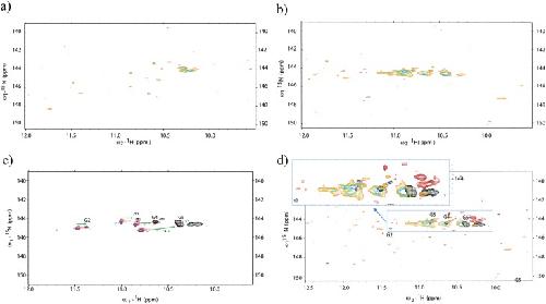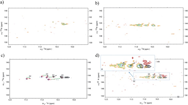 Fig. 3. Probing the ligand interaction with d(TG4T)4 using 1H–15N SOFAST-HMQC in vitro and in-cell. (a) Ligand incubated and freely diffused from the NMR tube buffer to the oocytes interior, previously microinjected with d(TG4T)4. In (b) we can see the in-cell spectrum that resulted from the incubation of a 2.5 molar ratio of ligand 360A with d(TG4T)4 for a period of 4 hours (room temperature) prior to co-microinjection in ∼200 Xenopus oocytes. Part (c) depicts the NMR titration experiments in vitro without ligand (blue), after incubation with 1 (red) and 2.5 (black) molar ratios of ligand to moles of d(TG4T)4. (d) Shows different spectra from (a) and (b) overlaid with the black spectrum of (c). All spectra were acquired at 16 °C. The spectra clearly show important differences in the organization of the d(TG4T)4 tetrads after ligand binding in vitro compared to the changes observed in-cell. All spectra were analysed taking into account peak assignments described previously12,32 together with in vitro