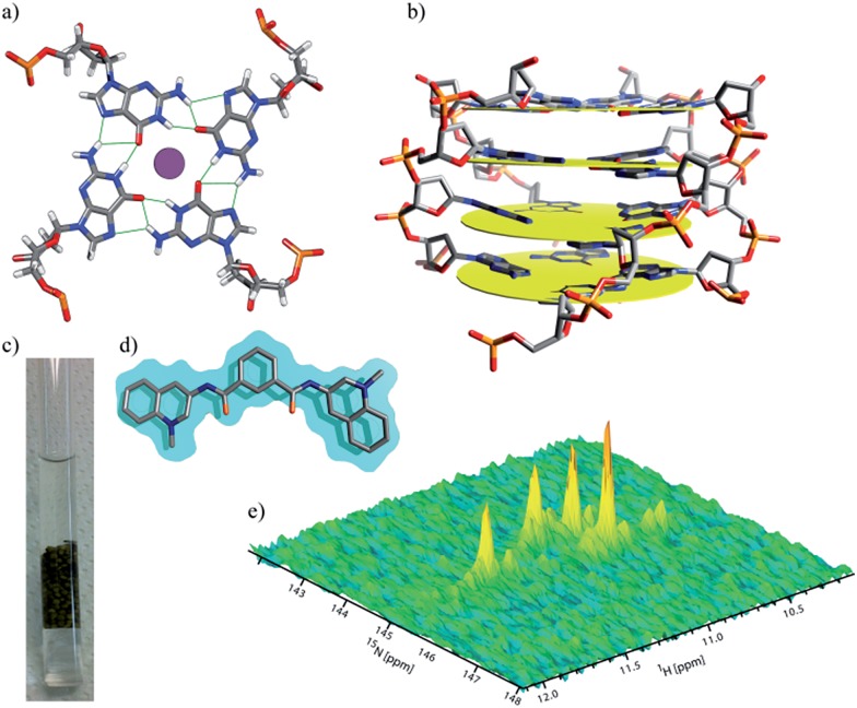 Fig. 1. Display of a typical tetrad of guanines, held by a network of hydrogen bonds, coordinating with a central metal cation in between two tetrads (a). Schematic representation of a stack of four tetrads commonly found in d(TG4T)4 (b). A 5 mm NMR Shigemi tube loaded with ∼200 Xenopus oocytes in 20% Ficoll buffer (c). Structure of ligand 360A (d). Imino signature of d(TG4T)4 in KCl buffer (e) obtained using a 1H–15N SOFAST-HMQC pulse sequence.